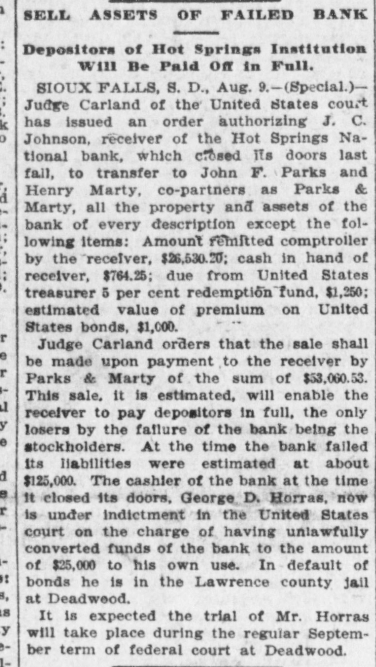 1 SELL ASSETS OF FAILED BANK Depositors of Hot Springs Institution will Be Paid Off in Full. SIOUX FALLS, S. D., Aug. 9.-(Special.)Judge Carland of the United States court has issued an order authorizing J. C. Johnson, receiver of the Hot Springs National bank, which closed its doors last fall, to transfer to John F. Parks and Henry Marty, co-partners as Parks & Marty, all the property and assets of the bank of every description except the following items: Amount remitted comptroller by the receiver, $26,530.20; cash in hand of receiver, $764.25; due from United States treasurer 5 per cent redemption fund, $1,250; estimated value of premium on United States bonds, $1,000. Judge Carland orders that the sale shall be made upon payment to the receiver by Parks & Marty of the sum of $53,060.53. This sale. it is estimated, will enable the receiver to pay depositors in full, the only losers by the failure of the bank being the stockholders. At the time the bank failed its liabilities were estimated at about $125,000. The cashier of the bank at the time it closed its doors, George D. Horras, now is under Indictment in the United States court on the charge of having unlawfully converted funds of the bank to the amount of $25,000 to his own use. In - default of bonds he is in the Lawrence county jail 8, at Deadwood. is It is expected the trial of Mr. Horras y will take place during the regular September term of federal court at Deadwood.