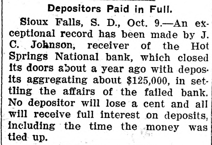 Depositors Paid in Full. Sioux Falls, S. D., Oct. 9.-An exceptional record has been made by J. C. Johnson, receiver of the Hot Springs National bank, which closed its doors about a year ago with depos. its aggregating about $125,000, in settling the affairs of the failed bank. No depositor will lose a cent and all will receive full interest on deposits, including the time the money was tied up.