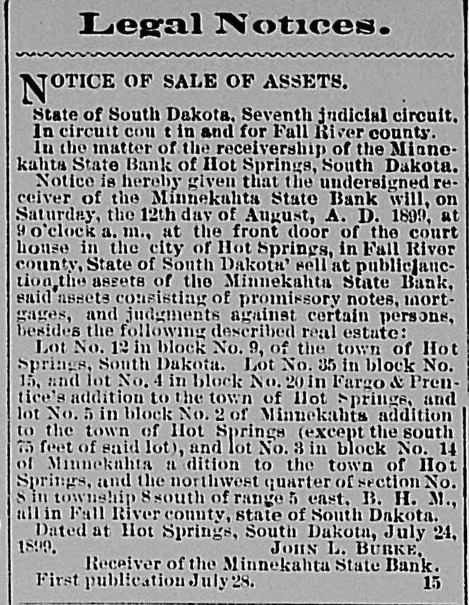 Legal Notices. N°TICE OF SALE OF ASSETS. State of South Dakota, Seventh judicial circuit. In circuit con t in and for Fall River county. In the matter of the receivership of the Minnekahta State Bank of Hot Springs, South Dakota. Notice is hereby given that the undersigned receiver of the Minnekahta State Bank will, on Saturday, the 12th day of August, A. D. 1899, at 9 o'clock a. m., at the front door of the court house in the city of Hot Springs, in Fall River county, State of South Dakota' sell at publicjanction,the assets of the Minnekahta State Bank, said assets consisting of promissory notes, mortgages, and judgments against certain persons, besides the following described real estate: Lot No. 12 in block No. 9, of the town of Hot Springs, South Dakota. Lot No. 35 in block No. 15, and lot No. 4 in block No. 20 in Fargo & Prentice's addition to the town of llot Springs, and lot No. 5 in block No. 2 of Minnekahts addition to the town of Hot Springs (except the south 75 feet of said lot), and lot No. 3 in block No. 14 of Minnekahta a dition to the town of Hot Springs, and the northwest quarter of section No. S in township Ssouth of range 5 east. B. H. M., all in Fall River county, state of South Dakota. Dated at Hot Springs, South Dakota, July 24, 1899, Jons L. BURKE, Receiver of the Minnekahta State Bank. 15 First publication July 28.