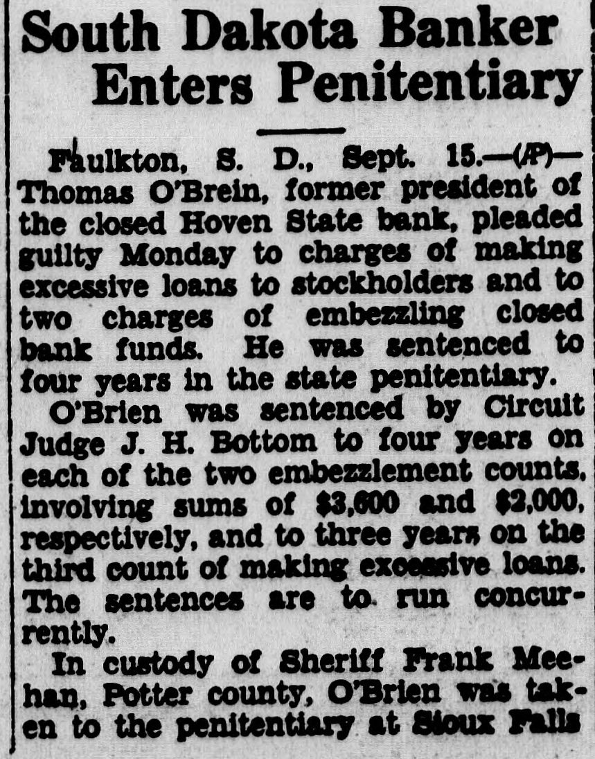 Thomas O'Brein, former president of the closed Hoven State bank, pleaded guilty ... He was sentenced to four years in the state penitentiary.