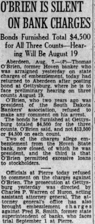 O'BRIEN IS SILENT ON BANK CHARGES Bonds Furnished Total $4,500 for All Three ing Will Be August 19 O'Brien, former Hoven banker arraigned yesterday on charges today had to Aberdeen Gettysburg where he preliminary hearing on three counts August O'Brien, who two years was South Bankers' association, refused comment on his arrest. bonds Gettysburg totaled for three counts. 'Brien said. and not $13,500 count. Two of the allege emfrom the Hoven State bank, closed, which he president, and third that O'Brien permitted excessive loans to stockholders. Officials at Pierre today refused the against O'Brien. The Gettysdirected Charles Warren Huron, acting attorney The torney general's office has brought against Fred R. Smith, former faces trial September at Pierre.