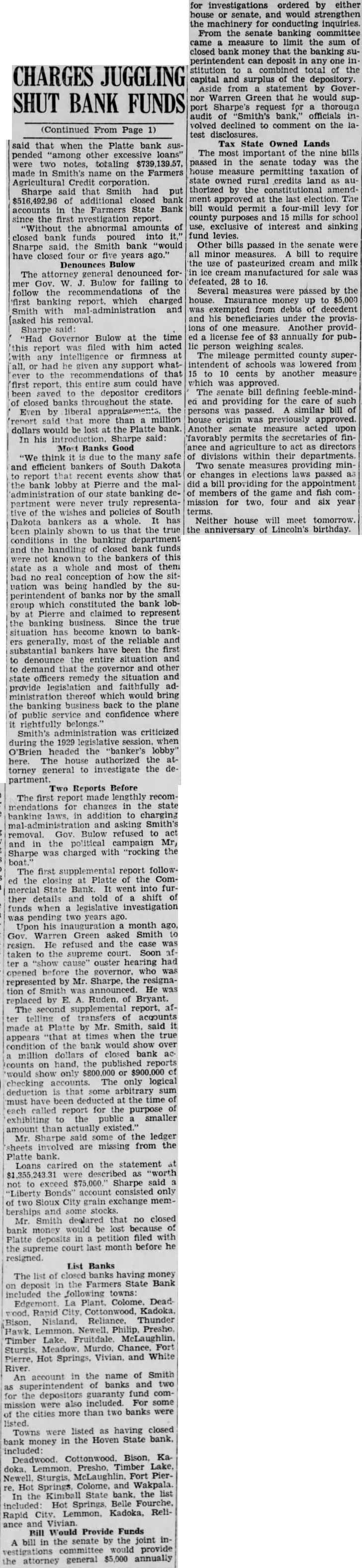 FUND, APPROVAL OF INVESTIGATION GIVEN BY SOLONS Sharpe's Charges of Big Loss in Public Funds Brings Quick Action AUDIT WILL BE PUSHED Attorney General Will Be Able to Make Check Following Legislation Pierre, Feb. for further of closed bank fund deposits by Fred R. Smith. former state superintendent banks, were under way today with of Governor Warren E. Green. Attorney General M. Q. Sharpe's charges yesterday that at in public funds would be lost in three banks through Smith's policies. the former's recommendation an brought quick the legislature. an which effective mediately investipowers of the attorney and annual for introduced in houses the joint Platte Bank Inquiry Passage bill, and action by the to provide funds, put Sharpe in position to make proposed as soon as legislative ization given. The attorney eral an audit of Farmers Platte, owned by Smith's he ported more than closed bank funds would be lost to deposThe other banks in which Smith of depositing amounts bank the Hoven State bank and the KimState said he support request for audit of the state department in order that Ruden. who replaced Smith as superintendent, could "start a clean Besides providing the bill presented yesterday would machinery for investigations by attorney either both houses. Under measure, attorney general examine all records of state departments, subpoena witSmith Silent who last month that no closed bank posits not comment today Sharpe's latest charges. Legislative after report filed but made no statements on the attorney general's for few hours after Sharpe's port filed. three ing were introduced in One would deposit of bank money in single Smith accused of making the Farmers State bank Platte. Introduced the senate bankthe bill limit closed funds which the can in any institution the combined and surplus the New depository Asked Frei presented bill to limit loans by banks any corporation to percent the bank's surplus. The present 20 per- other banking measure was bill to permit banks to pledge their assets to protect funds. Another banking passed by the senate Tuesday. was upon yesterday the banking committee the measure to make willful and gossip derogatory banks or trust companies felony.