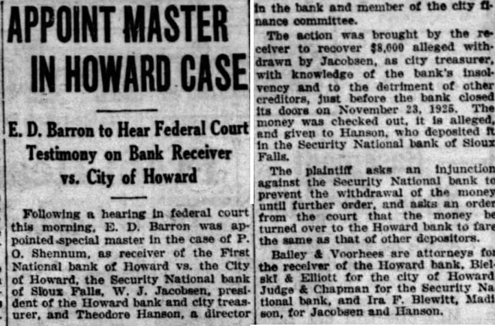 APPOINT MASTER IN HOWARD CASE E.D. Barron to Hear Federal Court Testimony on Bank Receiver vs. City of Howard Following a hearing in federal court this morning, E. D. Barron was pointed special master in the case of P. O. Shennum, as receiver of the First National bank of Howard the City Howard, the Security National bank of Sloux Falls, W. J. Jacobsen, president of the Howard bank and city treasurer, and Theodore Hanson, a director in the bank and member of the city fl. nance committee. The action was brought by the receiver to recover $8,000 alleged withdrawn by Jacobsen, as city treasurer, with knowledge of the bank's insolvency and to the detriment of other creditors, just before the bank closed doors November 23, 1925. The its on was checked is alleged, money and given to Hanson, who the Security National bank of Falls. The plaintiff asks an Injunction the bank to against the withdrawal of the money prevent until further order, and asks an order the court that the money be from turned over to the Howard bank to fare the same as that of other depositors. Bailey & Voorhees are attorneys for the receiver of the Howard & Elliott for the city of Howard, Judge & Chapman for the Security Na. tional bank, and Ira Blewitt, Madison, for Jacobsen and Hanson.