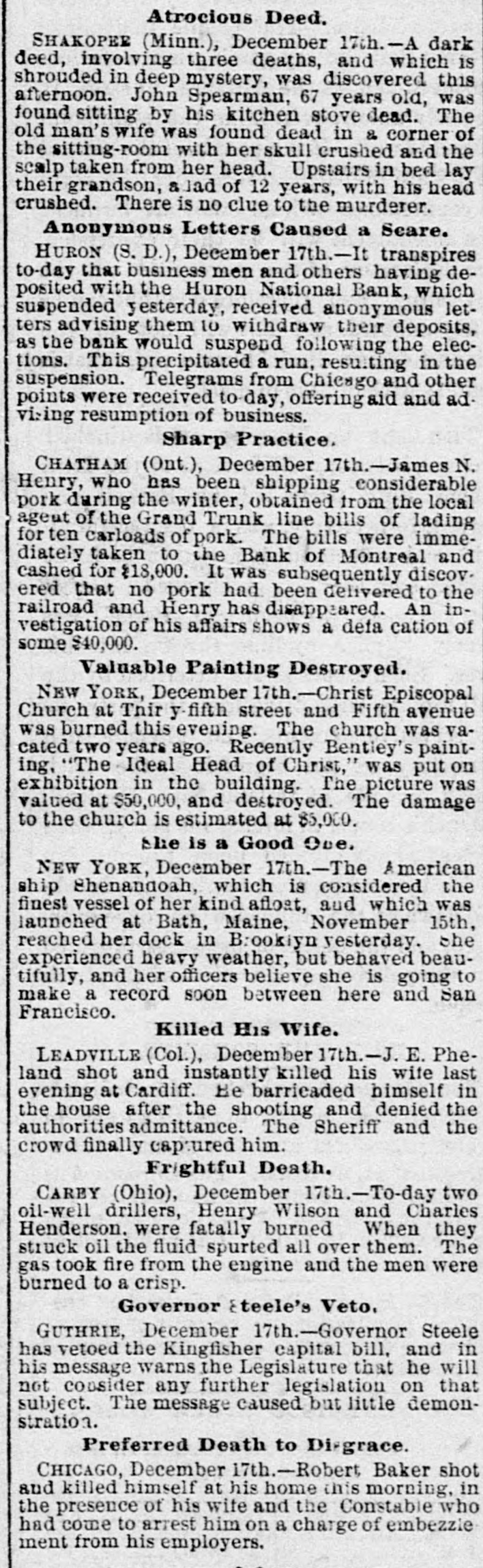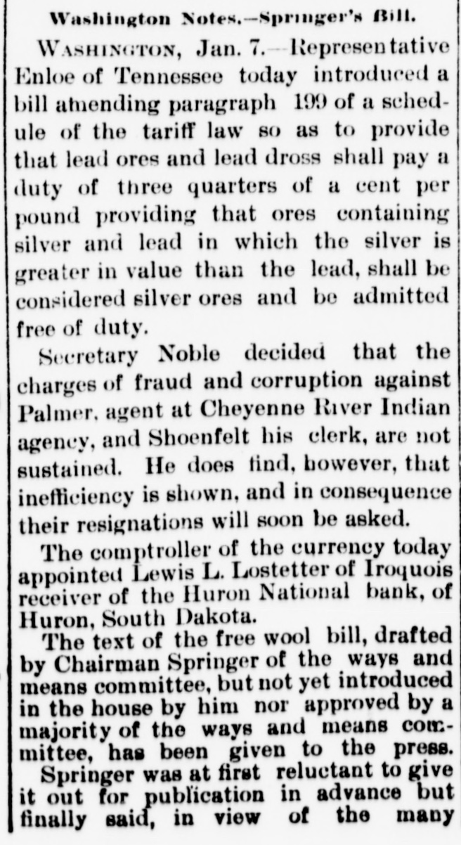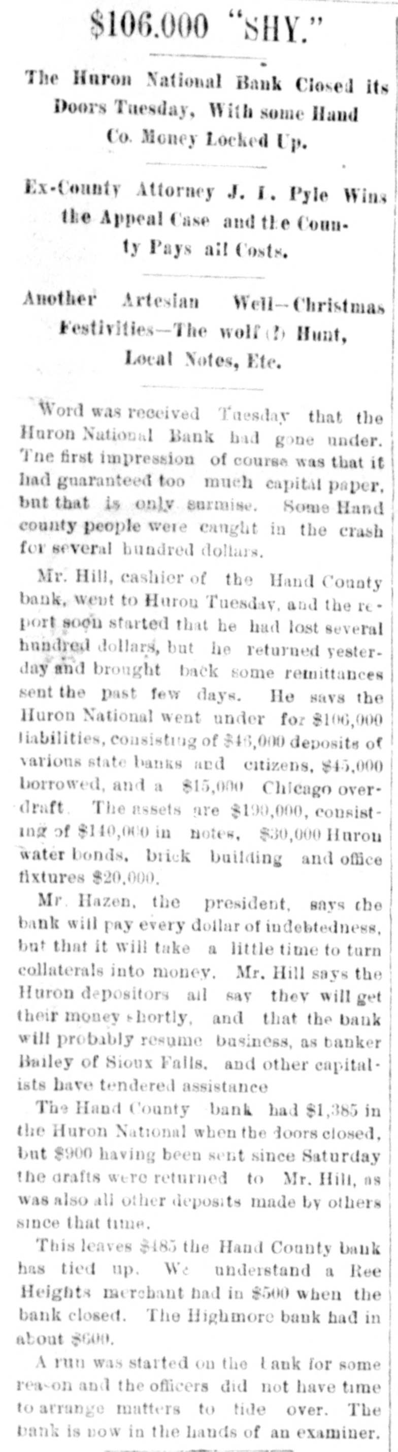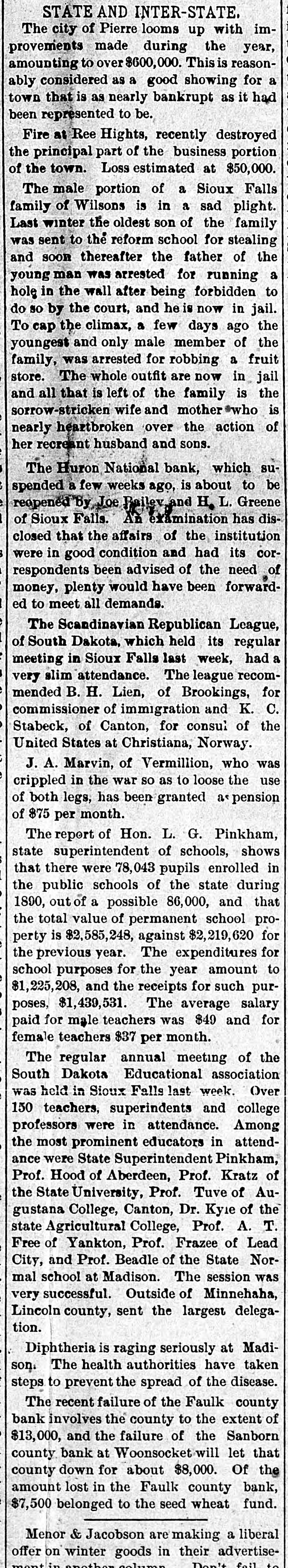 STATE AND INTER-STATE. The city of Pierre looms up with improvements made during the year, amounting to over $600,000. This is reasonably considered as a good showing for a town that is as nearly bankrupt as it had been represented to be. Fire at Ree Hights, recently destroyed the principal part of the business portion of the town. Loss estimated at $50,000. The male portion of a Sioux Falls family of Wilsons is in a sad plight. Last winter the oldest son of the family was sent to the reform school for stealing and SOOR thereafter the father of the young man was arrested for running a hole in the wall after being forbidden to do so by the court, and heis now in jail. To cap the climax, a few days ago the youngest and only male member of the family, was arrested for robbing a fruit store. The whole outfit are now in jail and all that is left of the family is the sorrow-stricken wife and mother who is nearly heartbroken over the action of her recreant husband and sons. The Huron National bank, which suspended a few weeks ago, is about to be reopened By Joe Bailev and H, L. Greene of Sioux Falls. An examination has disclosed that the affairs of the institution were in good condition and had its correspondents been advised of the need of money, plenty would have been forwarded to meet all demands. The Scandinavian Republican League, of South Dakota, which held its regular meeting in Sioux Falls last week, had a very slim attendance. The league recommended B. H. Lien, of Brookings, for commissioner of immigration and K. C. Stabeck, of Canton, for consul of the United States at Christiana, Norway. J. A. Marvin, of Vermillion, who was crippled in the war SO as to loose the use of both legs, has been granted as pension of $75 per month. The report of Hon. L. G. Pinkham, state superintendent of schools, shows that there were 78,043 pupils enrolled in the public schools of the state during 1890, out of a possible 86,000, and that the total value of permanent school property is $2,585,248, against $2,219,620 for the previous year. The expenditures for school purposes for the year amount to $1,225,208, and the receipts for such purposes, $1,439,531. The average salary paid for male teachers was $49 and for female teachers $37 per month. The regular annual meeting of the South Dakota Educational association was held in Sioux Falls last week. Over 150 teachers, superindents and college professors were in attendance. Among the most prominent educators in attendance were State Superintendent Pinkham, Prof. Hood of Aberdeen, Prof. Kratz of the State University, Prof. Tuve of Augustana College, Canton, Dr. Kyle of the state Agricultural College, Prof. A. T. Free of Yankton, Prof. Frazee of Lead City, and Prof. Beadle of the State Normal school at Madison. The session was very successful. Outside of Minnehaha, Lincoln county, sent the largest delegation. Diphtheria is raging seriously at Madison. The health authorities have taken steps to prevent the spread of the disease. The recent failure of the Faulk county bank involves the county to the extent of $13,000, and the failure of the Sanborn county bank at Woonsocket will let that county down for about $8,000. Of the amount lost in the Faulk county bank, $7,500 belonged to the seed wheat fund. Menor & Jacobson are making a liberal offer on winter goods in their advertiseto