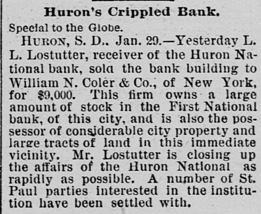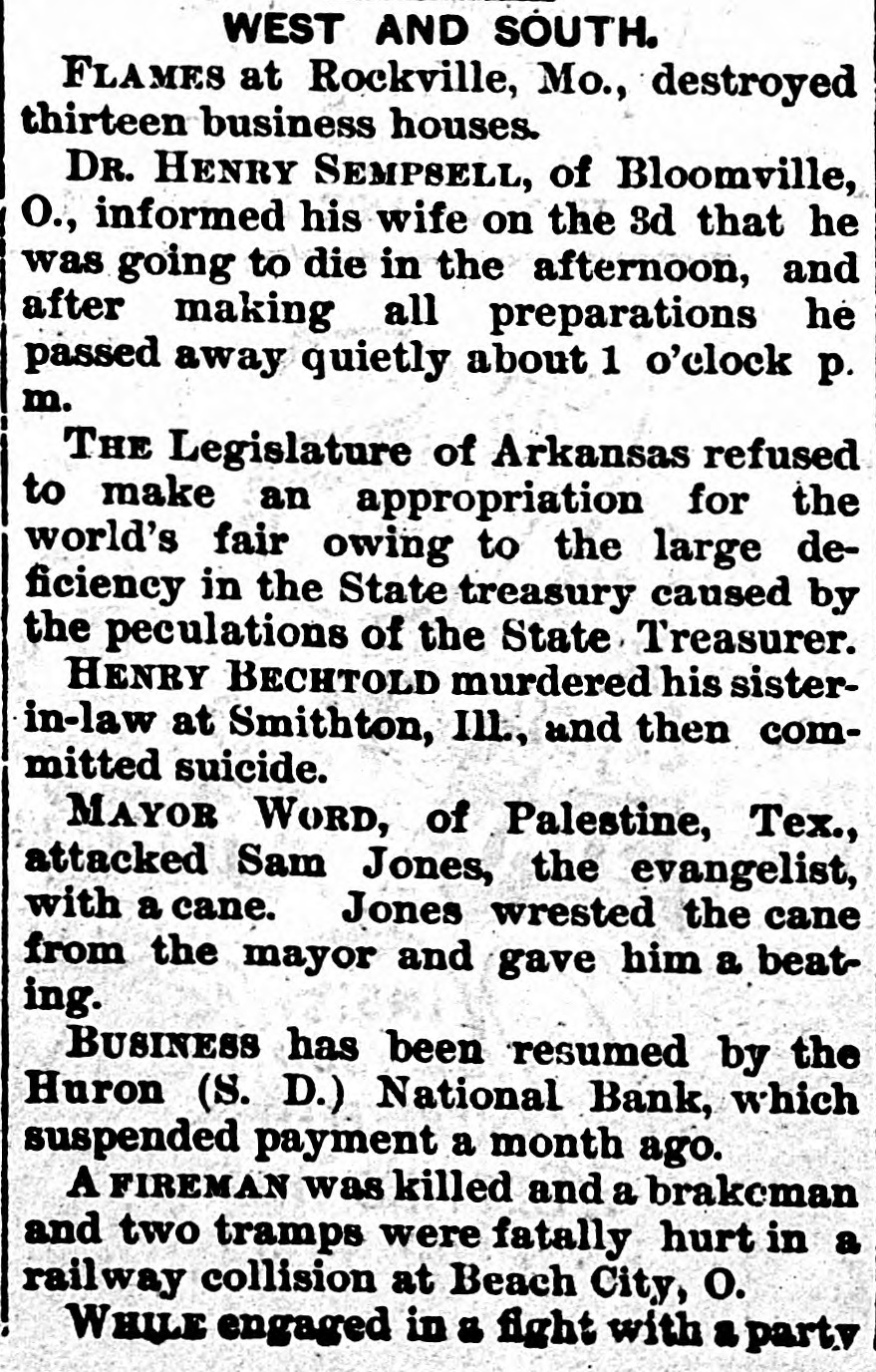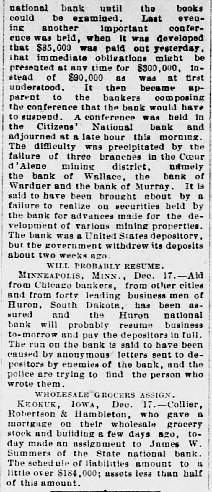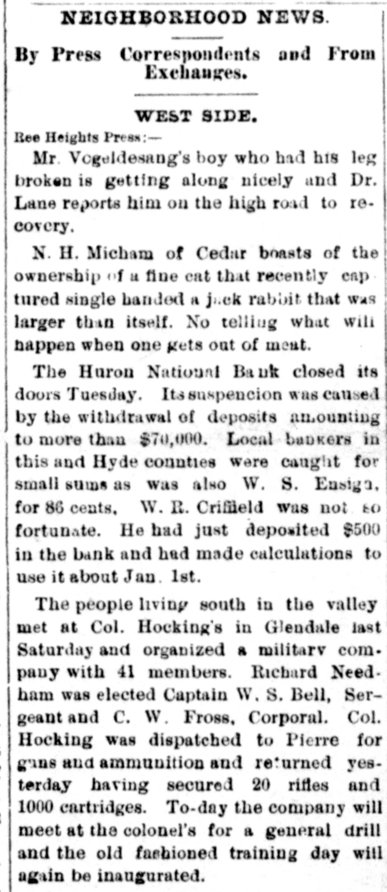 STATE AND INTER-STATE. The city of Pierre looms up with improvements made during the year, amounting to over $600,000. This is reasonably considered as a good showing for a town that is as nearly bankrupt as it had been represented to be. Fire at Ree Hights, recently destroyed the principal part of the business portion of the town. Loss estimated at $50,000. The male portion of a Sioux Falls family of Wilsons is in a sad plight. Last winter the oldest son of the family was sent to the reform school for stealing and SOOR thereafter the father of the young man was arrested for running a hole in the wall after being forbidden to do so by the court, and heis now in jail. To cap the climax, a few days ago the youngest and only male member of the family, was arrested for robbing a fruit store. The whole outfit are now in jail and all that is left of the family is the sorrow-stricken wife and mother who is nearly heartbroken over the action of her recreant husband and sons. The Huron National bank, which suspended a few weeks ago, is about to be reopened By Joe Bailev and H, L. Greene of Sioux Falls. An examination has disclosed that the affairs of the institution were in good condition and had its correspondents been advised of the need of money, plenty would have been forwarded to meet all demands. The Scandinavian Republican League, of South Dakota, which held its regular meeting in Sioux Falls last week, had a very slim attendance. The league recommended B. H. Lien, of Brookings, for commissioner of immigration and K. C. Stabeck, of Canton, for consul of the United States at Christiana, Norway. J. A. Marvin, of Vermillion, who was crippled in the war SO as to loose the use of both legs, has been granted as pension of $75 per month. The report of Hon. L. G. Pinkham, state superintendent of schools, shows that there were 78,043 pupils enrolled in the public schools of the state during 1890, out of a possible 86,000, and that the total value of permanent school property is $2,585,248, against $2,219,620 for the previous year. The expenditures for school purposes for the year amount to $1,225,208, and the receipts for such purposes, $1,439,531. The average salary paid for male teachers was $49 and for female teachers $37 per month. The regular annual meeting of the South Dakota Educational association was held in Sioux Falls last week. Over 150 teachers, superindents and college professors were in attendance. Among the most prominent educators in attendance were State Superintendent Pinkham, Prof. Hood of Aberdeen, Prof. Kratz of the State University, Prof. Tuve of Augustana College, Canton, Dr. Kyle of the state Agricultural College, Prof. A. T. Free of Yankton, Prof. Frazee of Lead City, and Prof. Beadle of the State Normal school at Madison. The session was very successful. Outside of Minnehaha, Lincoln county, sent the largest delegation. Diphtheria is raging seriously at Madison. The health authorities have taken steps to prevent the spread of the disease. The recent failure of the Faulk county bank involves the county to the extent of $13,000, and the failure of the Sanborn county bank at Woonsocket will let that county down for about $8,000. Of the amount lost in the Faulk county bank, $7,500 belonged to the seed wheat fund. Menor & Jacobson are making a liberal offer on winter goods in their advertiseto
