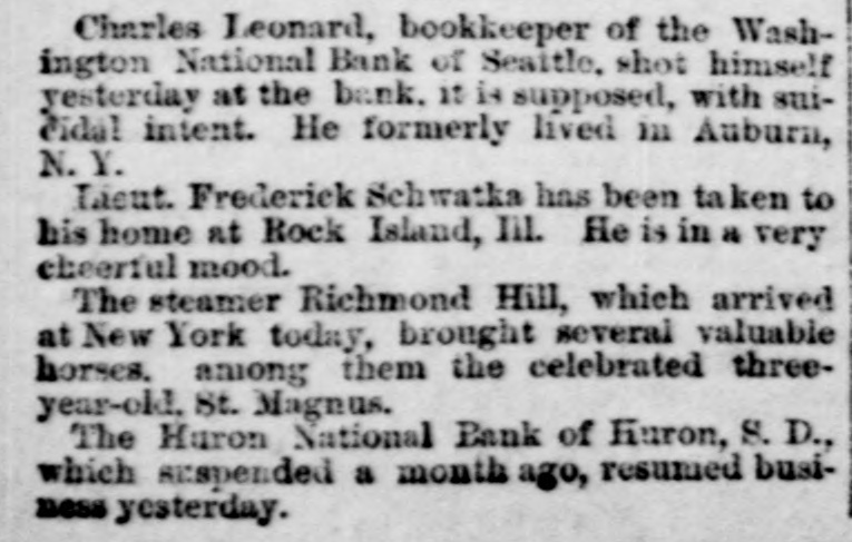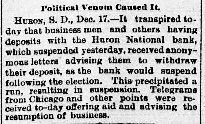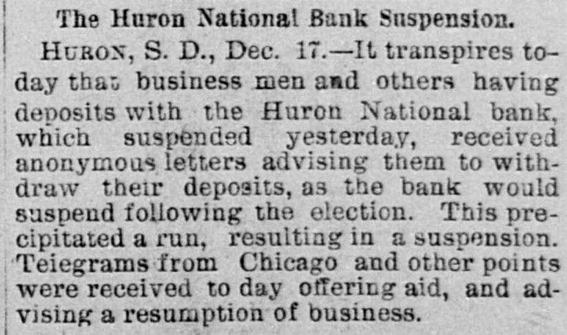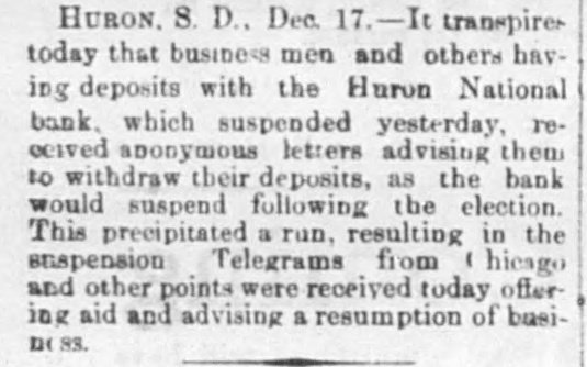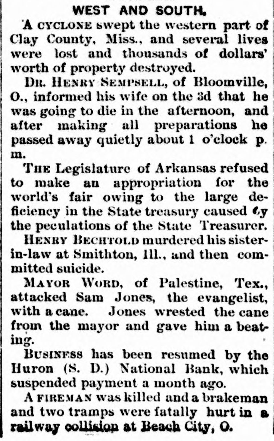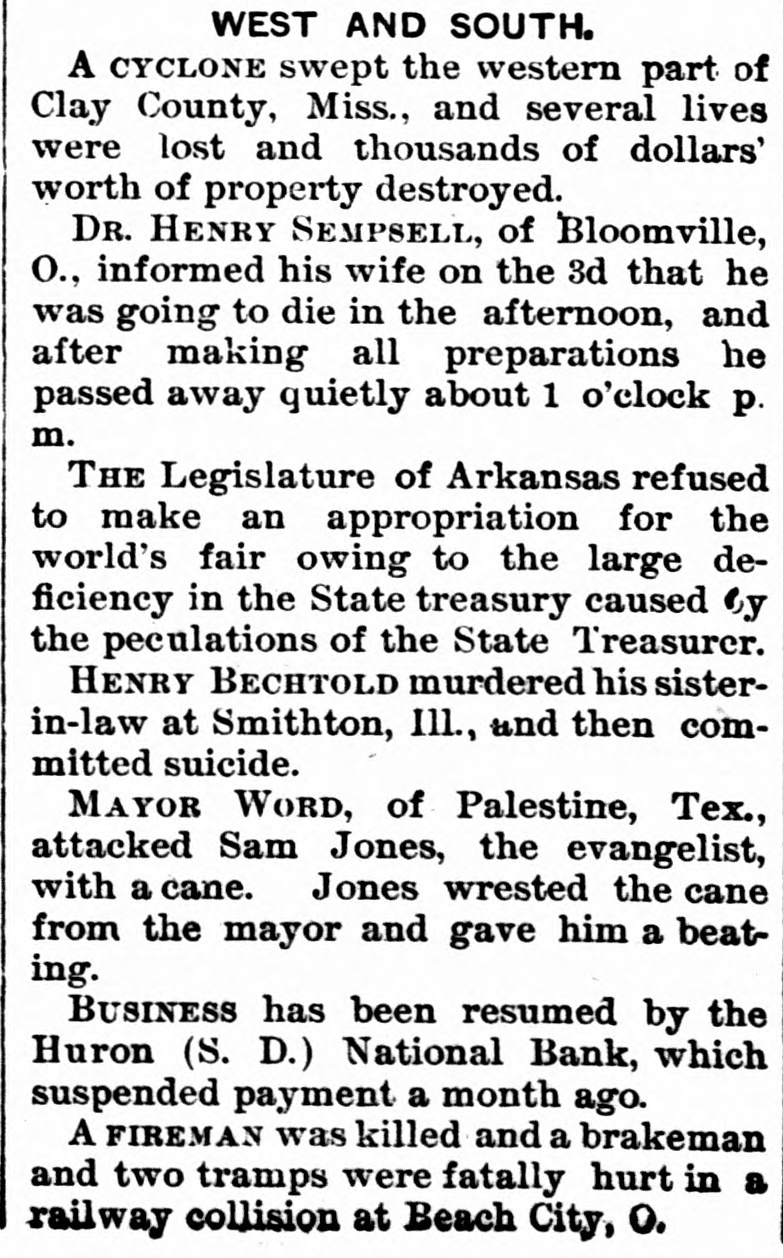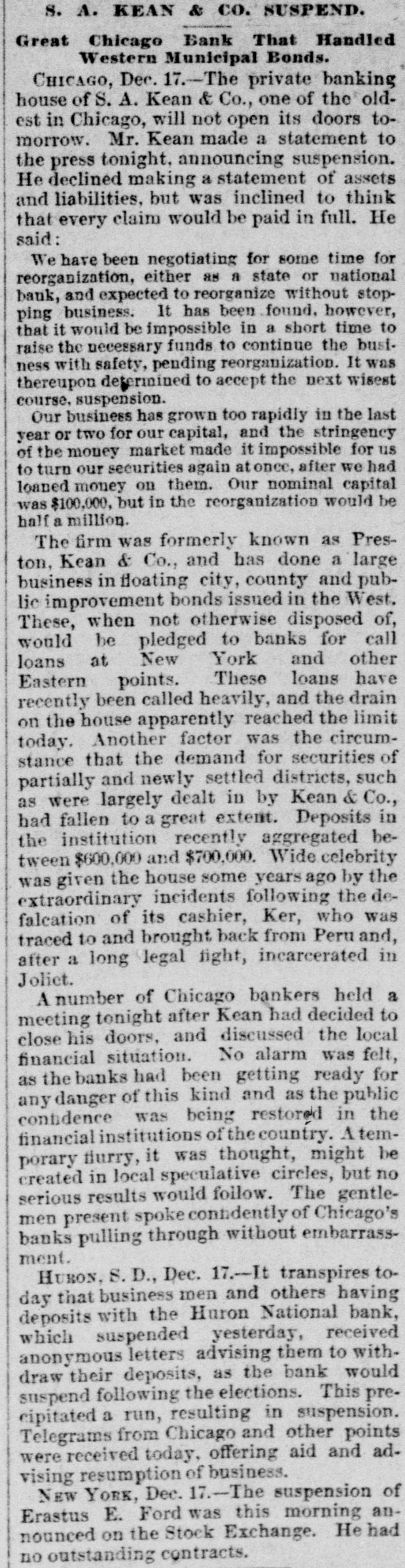 STATE AND INTER-STATE. The city of Pierre looms up with improvements made during the year, amounting to over $600,000. This is reasonably considered as a good showing for a town that is as nearly bankrupt as it had been represented to be. Fire at Ree Hights, recently destroyed the principal part of the business portion of the town. Loss estimated at $50,000. The male portion of a Sioux Falls family of Wilsons is in a sad plight. Last winter the oldest son of the family was sent to the reform school for stealing and SOOR thereafter the father of the young man was arrested for running a hole in the wall after being forbidden to do so by the court, and heis now in jail. To cap the climax, a few days ago the youngest and only male member of the family, was arrested for robbing a fruit store. The whole outfit are now in jail and all that is left of the family is the sorrow-stricken wife and mother who is nearly heartbroken over the action of her recreant husband and sons. The Huron National bank, which suspended a few weeks ago, is about to be reopened By Joe Bailev and H, L. Greene of Sioux Falls. An examination has disclosed that the affairs of the institution were in good condition and had its correspondents been advised of the need of money, plenty would have been forwarded to meet all demands. The Scandinavian Republican League, of South Dakota, which held its regular meeting in Sioux Falls last week, had a very slim attendance. The league recommended B. H. Lien, of Brookings, for commissioner of immigration and K. C. Stabeck, of Canton, for consul of the United States at Christiana, Norway. J. A. Marvin, of Vermillion, who was crippled in the war SO as to loose the use of both legs, has been granted as pension of $75 per month. The report of Hon. L. G. Pinkham, state superintendent of schools, shows that there were 78,043 pupils enrolled in the public schools of the state during 1890, out of a possible 86,000, and that the total value of permanent school property is $2,585,248, against $2,219,620 for the previous year. The expenditures for school purposes for the year amount to $1,225,208, and the receipts for such purposes, $1,439,531. The average salary paid for male teachers was $49 and for female teachers $37 per month. The regular annual meeting of the South Dakota Educational association was held in Sioux Falls last week. Over 150 teachers, superindents and college professors were in attendance. Among the most prominent educators in attendance were State Superintendent Pinkham, Prof. Hood of Aberdeen, Prof. Kratz of the State University, Prof. Tuve of Augustana College, Canton, Dr. Kyle of the state Agricultural College, Prof. A. T. Free of Yankton, Prof. Frazee of Lead City, and Prof. Beadle of the State Normal school at Madison. The session was very successful. Outside of Minnehaha, Lincoln county, sent the largest delegation. Diphtheria is raging seriously at Madison. The health authorities have taken steps to prevent the spread of the disease. The recent failure of the Faulk county bank involves the county to the extent of $13,000, and the failure of the Sanborn county bank at Woonsocket will let that county down for about $8,000. Of the amount lost in the Faulk county bank, $7,500 belonged to the seed wheat fund. Menor & Jacobson are making a liberal offer on winter goods in their advertiseto