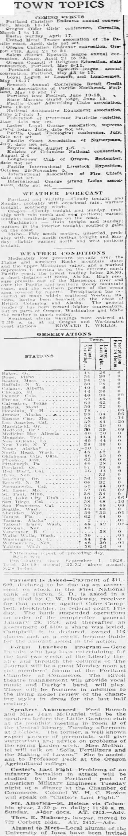 TOWN TOPICS COMING Older Girls' 17. of the PaOreleague annual Oregon state annual Retail Credit PortCoast Advertising Clubs association, Automotive Protestant supreme Theological conference, Coast Association of Nurserymen, National convention, Club of International Livestock Association of Fire Chiefs. Orange Grand Lodge associ- WEATHER FORECAST tonight occasional prob warmer tonight interior southerly gales south north north west portions tonight. WEATHER DITIONS the Rocky reading being Mississippi portion the states the and toward higher ashington Idaho colder ordered stations EDWARD OBSERVATIONS to due the National bank of Huron is asked in receiver for that against Coler Campin federal court Frisuspended order the comptroller general January an of Campbell, declared. owned 116 shares became liable the Forum Luncheon Program Gene has for the last the Liberty theand through the columns of The Journal be guest Monday noon at members forum Portland of Commerce. The Rivoli theatre vocal music Darby's band play These be features in addition to the living review of the changing styles in dress for the last half century Speakers Announced Fred Borsch Jean Daniel be the the Gardens club at its in room of the at former. known expert of perennials, will give and advice on problems of the spring garden work. Miss McDanthe Making of assistPeck at the Oregon Agricultural Custer's Last of an Infantry battalion will be studied by the Portland post American Military Engineers Tuesday night at dinner at the Chamber of Colonel H. speak on "Custer's Last Fight. Str. Helens via Columbia Thos. R. Mahoney. moved to 722 Corbett Alumni to alumni of the University Iowa have Invited STATIONS Alberta Lake preceding 1926 normal