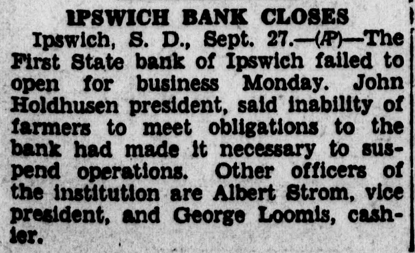 IPSWICH BANK CLOSES Ipswich, S. D., Sept. 27.-(P)-The First State bank of Ipswich failed to open for business Monday. John Holdhusen president, said inability of farmers to meet obligations to the bank had made it necessary to suspend operations. Other officers of the institution are Albert Strom, vice president, and George Loomis, cashier.