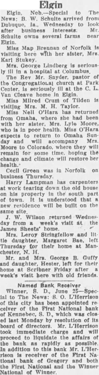 to The News: W. Schulte from Dubuque, Wednesday to look after business Mr. Schulte owns several farms near Elgin. Miss Map Brennan of Norfolk visiting here with her sister, Mrs. Karl Stukey. Mrs. George Lindberg is serious hospital Columbus. The Rev Mr. Snyder, pastor of the Congregational church Park Center, seriously the Van Elgin. Miss Milred Crum Tilden visiting Mrs. H. Taylor. Miss Nell O'Hara has returned from Omaha, where she had been with her sister. Mrs. Moore, who in health. Miss O'Hara poor expects to return to Omaha Sunday and Mrs. accompany Moore Colorado, where they will remain for some time. hoping the change and climate will restore her Cecil Green in Norfolk on business Thursday. Harry Lampman has carpenters work tearing down the old house his property south part town. understood that residence will be built on the site W. Wilson returned Wednesday from week's visit at the James Sheets' home. Mrs. Leroy Stringfellow and Ift tle daughter, Margaret Bae, left Thursday for their home at Manchester, and Mrs. George Guffy daughter, Hester, left for their home Scribner Friday after week's visit here with old friends. Named Bank Receiver Winner, June to The News: L'Herrison this city has been appointed celver of the First National bank Kennebec, which closlast Monday by resolution of its board directors. Mr. L'Herrison took immediate charge and will proceed to liquidate affairs the bank as rapidly as possible. In addition to L'Herrison of the First Na tional bank of and both the First and the Winner National of Winner.