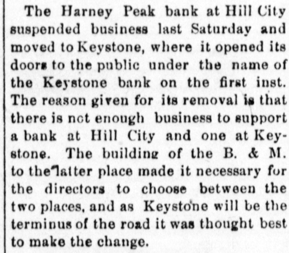 The Harney Peak bank at Hill City suspended business last Saturday and moved to Keystone, where it opened its doors to the public under the name of the Keystone bank on the first inst. The reason given for its removal is that there is not enough business to support a bank at Hill City and one at Keystone. The building of the B. & M. to the latter place made it necessary for the directors to choose between the ta a places, and as Keystone will be the terminus of the road it was thought best to make the change.
