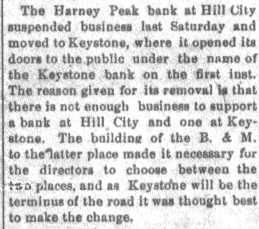 The Harney Peak bank at Hill City suspended business last Saturday and moved to Keystone, where it opened its doors to the public under the name of the Keystone bank on the first inst. The reason given for its removal is that there is not enough business to support a bank at Hill City and one at Keystone. The building of the B. & M. to the laiter place made it necessary for the directors to choose between the two places. and as Keystone will be the terminus of the road it was thought best to make the change.