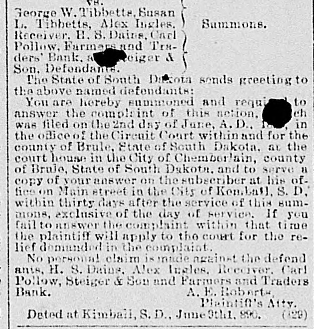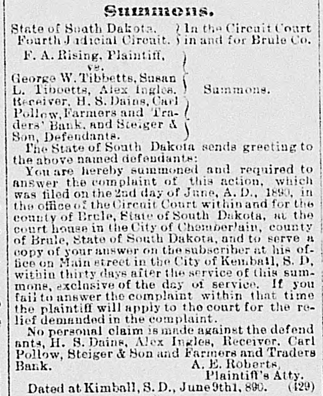 VS. George W. Tibbetts, Susan Summons. L. Tibbetts, Alex Ingles. Receiver. H. 8. Dains, Carl Pollow, Farmers and Traders' Bank, a teiger & Son. Defendante. The State of South Dirkota sends greeting to the above named defendants: to You are hereby summoned and requi ch answer the complaint of this nction, in was filed on the 2nd day of June, A. D., the office of the Circuit Court within and for the county of Brule, State of South Dakota. at the court house in the City of Chembor/ain, county of Brule, State of South Dakota. and to serve 11 copy of your answer on the subscriber at his office on Main street in the City of Kemball, S. D. within thirty days after the service of this summons, exclusive of the day of service. If you fail to answer the complaint within that time the plaintiff will apply to the court for the relief demanded in the complaint. No personal claim is made against the defend ants, H. S. Dains, Alex Ingles, Receiver. Carl Pollow, Steiger & Son and Farmers and Traders Bank. A. E. Roberts, Plaintiff's Aity. Dated at Kimball, S.D., June 9tht. (129)