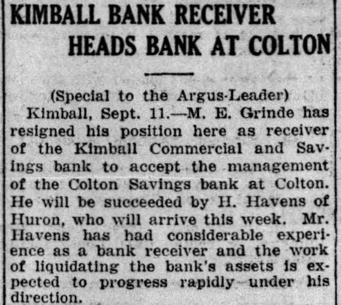 KIMBALL BANK RECEIVER HEADS BANK AT COLTON (Special to the Kimball, Sept. E. Grinde has resigned his position here as receiver of the Kimball Commercial and SavIngs bank to accept the management the Colton Savings bank at Colton. He will be succeeded by H. Havens of Huron, who will arrive this week. Mr. Havens has had considerable experias receiver and the work of the bank's is pected progress rapidly under his direction.