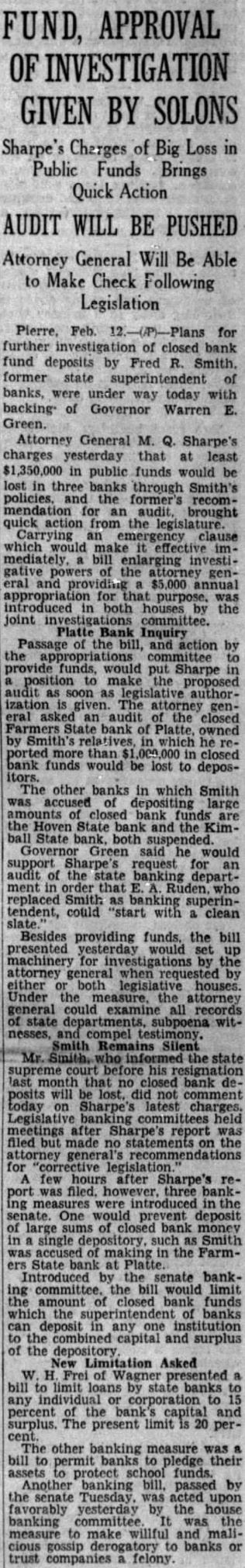 Bill Is Introduced Asking Immediate Funds For Inquiry Governor Green Backing MoveTo Secure Thorough ment Audit of Smith's Banking Transactions Once. Feb. for furthclosed bank fund deinvestigation Fred Smith, former state posits by banks, were under superintendent with backing of Governor way today Green. General M. Sharpe's Attorney charges yesterday that least public funds would be lost in three banks through Smith's policies, and the former's for audit. brought quick action from the legislature. Carrying an emergency clause which would make effective bill powers the and $5,000 attorney general for that annual introduced both houses by the Passage of the bill. and action by the provide funds put Sharpe in make the proposed audit soon legislative authorization given. The attorney audit of the closed general asked Farmers State Bank of Platte, owned by Smith's relatives. which reported $1,000,000 closed bank more than funds would be lost to depositors. Wants Department Audit The other banks in which Smith of depositing large amounts accused closed bank funds the Hoven State Bank and the Kimball State Bank, both suspended. Governor Green said he would support Sharpe's request for an audit the bank" Platte. The executive would an audit also said approve the State Banking department order that Ruden Bryant, who placed Smith banking superintendent, could "start with clean state." funds, the bill preBesides providing sonted yesterday set up machinery for investigations by the attorney eral when requested by either both legislative houses. Under the the general could all records of state subpoena and compel testimony Mr. who informed the state court before his month that closed bank deosits will lost, did comment today on Sharpe's latest charges. Legislative ing committees meetings Sharpe's report was filed but made statements the attorney for "corrective Jegisla- New Measures Up A few hours after Sharpe's report was filed, however, three banking measures introduced the senate. One would prevent deposit of large surhs closed bank money in single deposisuch Smith was accused of making the Farmers State Bank Platte. Introduced scnate banking mittee, the bill would limit the amount closed bank funds which the superintendent of banks deposit any one institution the combined capital and surplus of the depository. Frei Wagner presented bill limit loans by state banks to any dividual corporation to per the bank's capital and surplus. The limit per cent. other was bill permit banks to pledge their assets to protect school funds. banking bill passed by the senate Tuesday, upon unfavorably yesterday by the house banking committee. was the make wilful and malicious derogatory banks or trust companies felony.