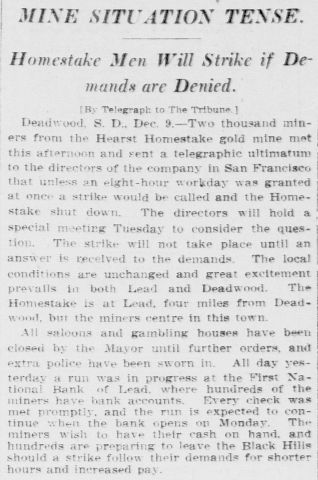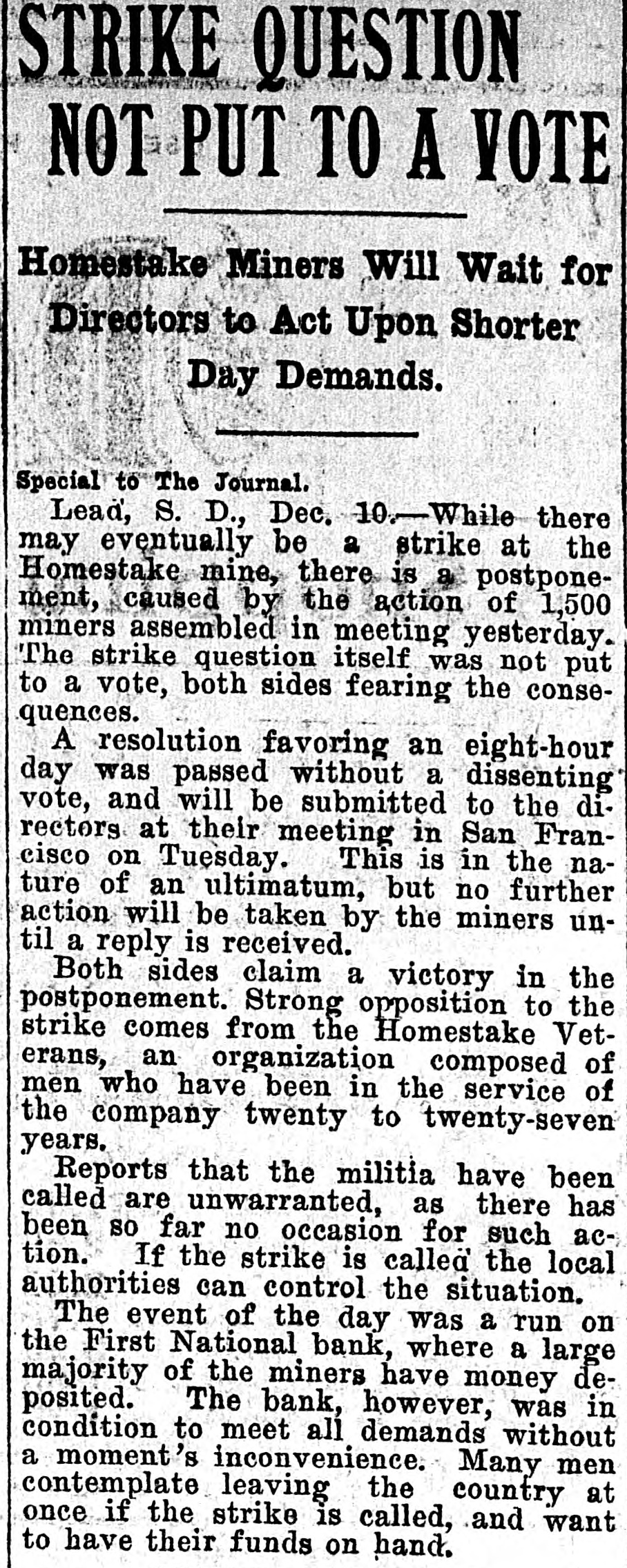 STRIKE QUESTION NOT PUT TO A VOTE Homestake Miners Will Wait for Directors to Act Upon Shorter Day Demands. Special to The Journal. Lead, S. D., Dec. 10.-While there may eventually be a strike at the Homestake mine, there is a postponement, caused by the action of 1,500 miners assembled in meeting yesterday. The strike question itself was not put to a vote, both sides fearing the consequences. A resolution favoring an eight-hour day was passed without a dissenting vote, and will be submitted to the directors at their meeting in San Francisco on Tuesday. This is in the nature of an ultimatum, but no further action will be taken by the miners until a reply is received. Both sides claim a victory in the postponement. Strong opposition to the strike comes from the Homestake Veterans, an organization composed of men who have been in the service of the company twenty to twenty-seven years. Reports that the militia have been called are unwarranted, as there has been so far no occasion for such action. If the strike is called the local authorities can control the situation. The event of the day was a run on the First National bank, where a large majority of the miners have money deposited. The bank, however, was in condition to meet all demands without a moment's inconvenience. Many men contemplate leaving the country at once if the strike is called, and want to have their funds on hand.