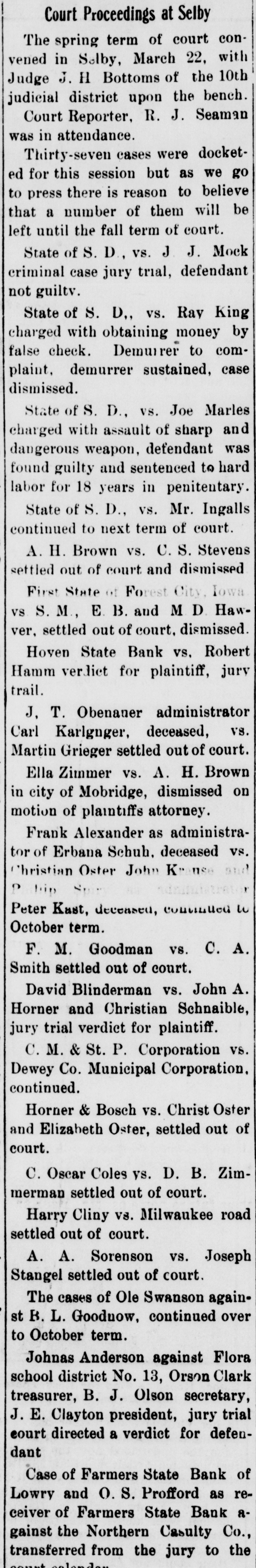Court Proceedings at Selby The spring term of court convened in Selby, March 22, with Judge J. H Bottoms of the 10th judicial district upon the bench. Court Reporter, R. J. Seaman was in attendance. Thirty-seven cases were docketed for this session but as we go to press there is reason to believe that a number of them will be left until the fall term of court. State of S. D., vs. J J. Mock criminal case jury trial, defendant not guiltv. State of S. D,, vs. Ray King charged with obtaining money by false check. Demuirer to complaint, demurrer sustained, case dismissed. State of S. D., vs. Joe Marles charged with assault of sharp and dangerous weapon, defendant was found guilty and sentenced to hard labor for 18 years in penitentary. State of S. D., vs. Mr. Ingalls continued to next term of court. A. H. Brown vs. C. S. Stevens settled out of court and dismissed First State of Forest City, Iowa VS S. M., E. B. and M D. Hawver, settled out of court, dismissed. Hoven State Bank vs. Robert Hamm verdict for plaintiff, jury trail. J, T. Obenauer administrator Carl Karlgnger, deceased, vs. Martin Grieger settled out of court. Ella Zimmer vs. A. H. Brown in city of Mobridge, dismissed on motion of plaintiffs attorney. Frank Alexander as administrator of Erbana Schub, deceased vs. Christian Oster John Krause and P Peter Kast, deceased, continued 10 October term. F. M. Goodman vs. C. A. Smith settled out of court. David Blinderman vs. John A. Horner and Christian Schnaible, jury trial verdict for plaintiff. C. M. & St. P. Corporation vs. Dewey Co. Municipal Corporation. continued. Horner & Bosch vs. Christ Oster and Elizabeth Oster, settled out of court. C. Oscar Coles vs. D. B. Zimmerman settled out of court. Harry Cliny vs. Milwaukee road settled out of court. A. A. Sorenson vs. Joseph Stangel settled out of court. The cases of Ole Swanson against B. L. Goodnow, continued over to October term. Johnas Anderson against Flora school district No. 13, Orson Clark treasurer, B. J. Olson secretary, J. E. Clayton president, jury trial eourt directed a verdict for defendant Case of Farmers State Bank of Lowry and O. S. Profford as receiver of Farmers State Bank against the Northern Casulty Co., transferred from the jury to the court