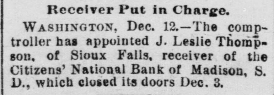 Receiver Put in Charge. WASHINGTON, Dec. 12.-The comptroller has appointed J. Leslie Thompson. of Sioux Falls, receiver of the Citizens' National Bank of Madison, S. D., which closed its doors Dec. 3.