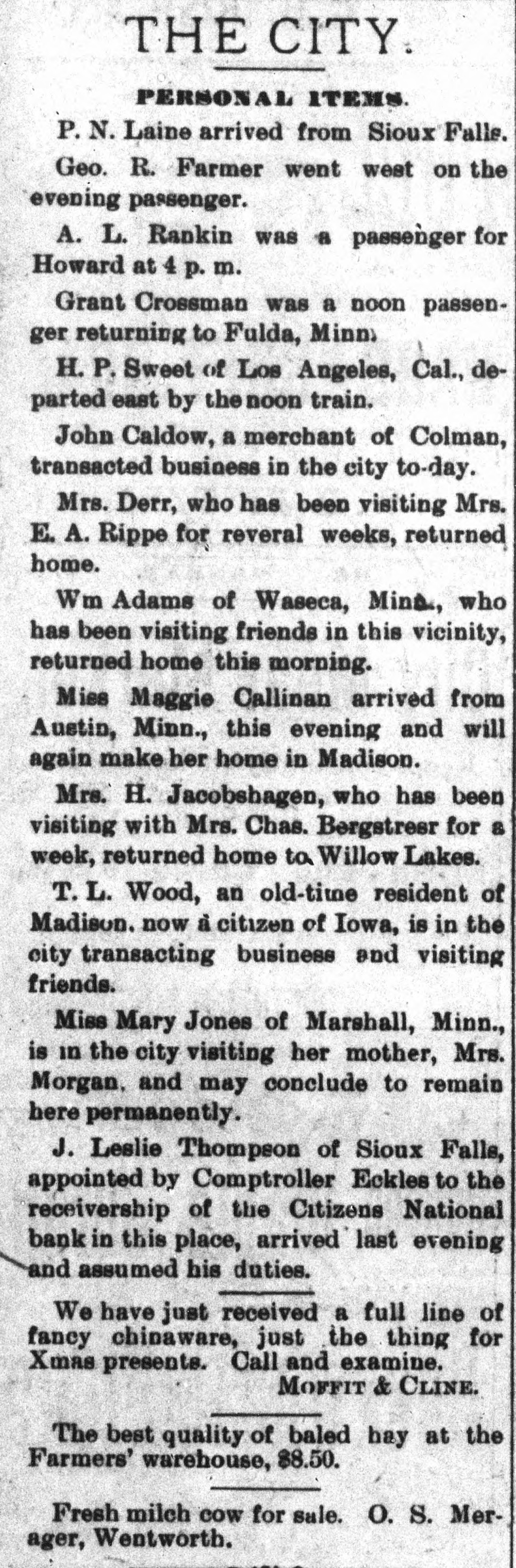 THE CITY. PERSONAL ITEMS. P. N. Laine arrived from Sioux Falls. Geo. R. Farmer went west on the evening passenger. A. L. Rankin was a passenger for Howard at 4 p. m. Grant Crossman was a noon passenger returning to Fulda, Minn. H. P. Sweet of Los Angeles, Cal., departed east by the noon train. John Caldow, a merchant of Colman, transacted business in the city to-day. Mrs. Derr, who has been visiting Mrs. E. A. Rippe for reveral weeks, returned home. Wm Adams of Waseca, Mina, who has been visiting friends in this vicinity, returned home this morning. Miss Maggie Callinan arrived from Austin, Minn., this evening and will again make her home in Madison. Mrs. H. Jacobshagen, who has been visiting with Mrs. Chas. Bergstresr for a week, returned home to Willow Lakes. T. L. Wood, an old-time resident of Madison. now à citizen of Iowa, is in the city transacting business and visiting friends. Miss Mary Jones of Marshall, Minn., is in the city visiting her mother, Mrs. Morgan, and may conclude to remain here permanently. J. Leslie Thompson of Sioux Falls, appointed by Comptroller Eckles to the receivership of the Citizens National bank in this place, arrived last evening and assumed his duties. We have just received a full line of fancy chinaware, just the thing for Xmas presents. Call and examine. MOFFIT & CLINE. The best quality of baled hay at the Farmers' warehouse, $8.50. Fresh milch cow for sale. O. S. Merager, Wentworth.