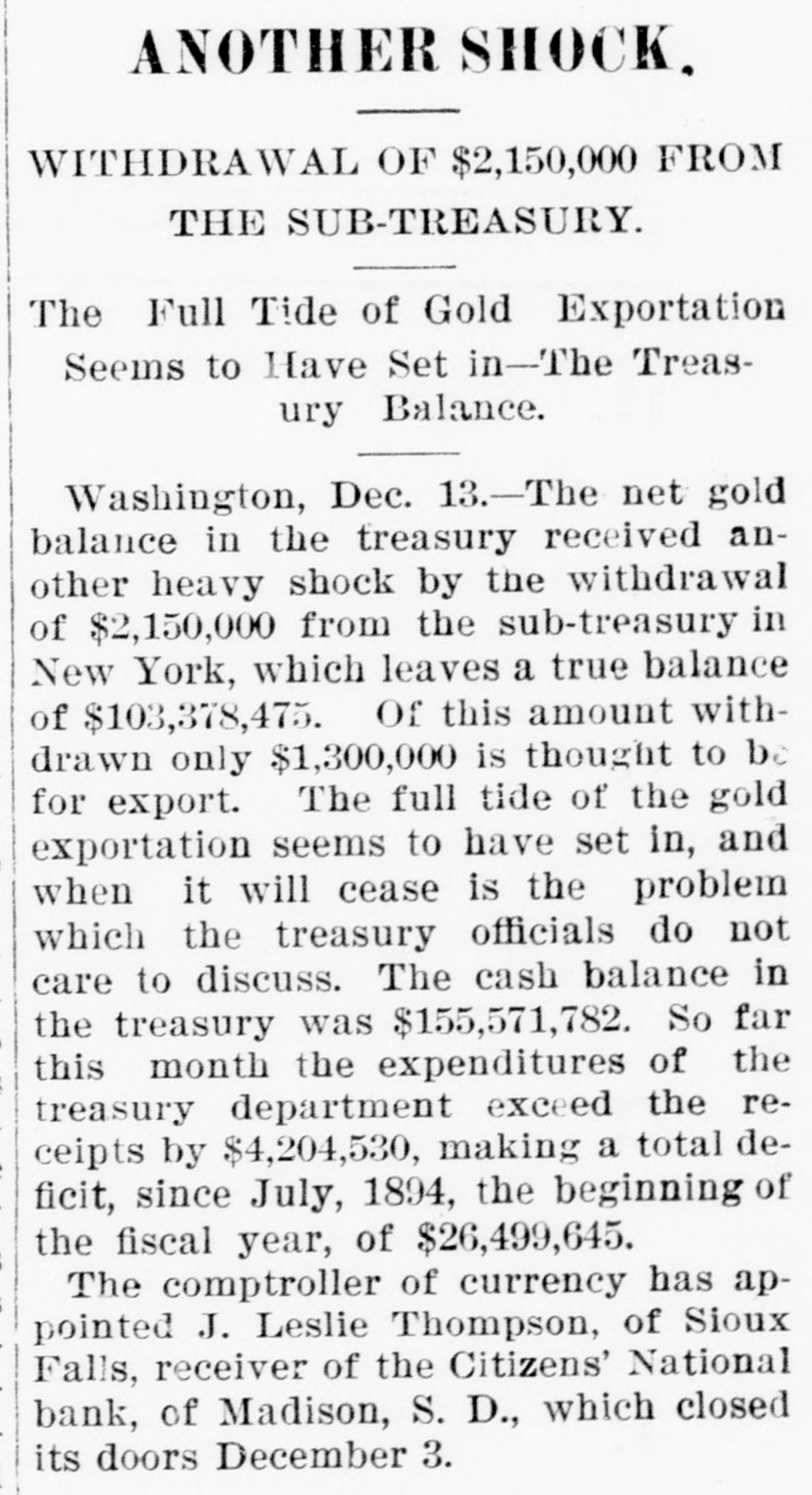 ANOTHER SHOCK. WITHDRAWAL OF $2,150,000 FROM THE SUB-TREASURY. The Full Tide of Gold Exportation Seems to Have Set in-The Treasury Balance. Washington, Dec. 13.-The net gold balance in the treasury received another heavy shock by the withdrawal of $2,150,000 from the sub-treasury in New York, which leaves a true balance of $103,378,475. Of this amount withdrawn only $1,300,000 is thought to be for export. The full tide of the gold exportation seems to have set in, and when it will cease is the problem which the treasury officials do not care to discuss. The cash balance in the treasury was $155,571,782. So far this month the expenditures of the treasury department exceed the receipts by $4,204,530, making a total deficit, since July, 1894, the beginning of the fiscal year, of $26,499,645. The comptroller of currency has appointed J. Leslie Thompson, of Sioux Falls, receiver of the Citizens' National bank, of Madison, S. D., which closed its doors December 3.