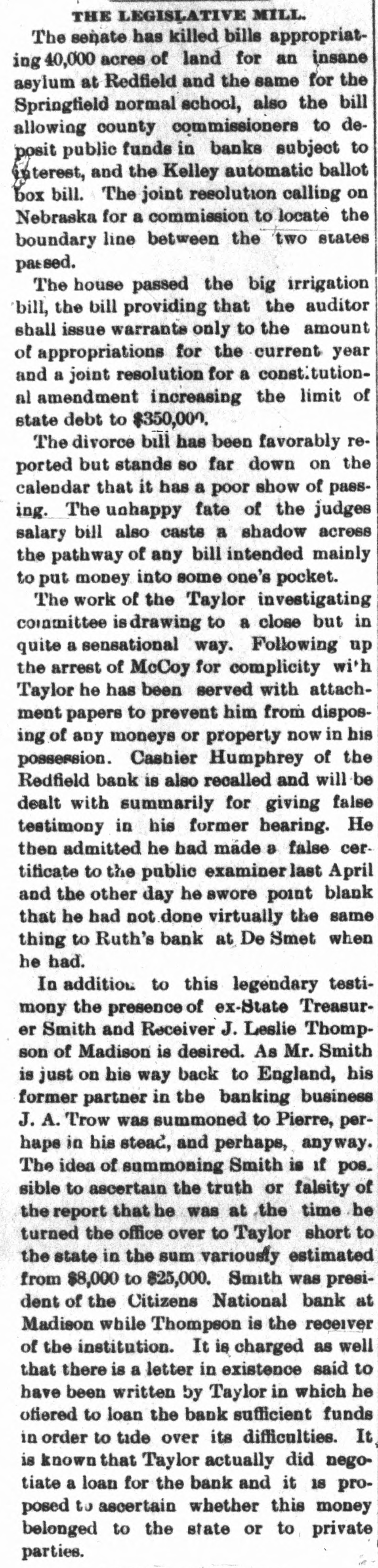 # THE LEGISLATIVE MILL. The senate has killed bills appropriating 40,000 acres of land for an insane asylum at Redfield and the same for the Springfield normal school, also the bill allowing county commissioners to deposit public funds in banks subject to interest, and the Kelley automatic ballot box bill. The joint resolution calling on Nebraska for a commission to locate the boundary line between the two states passed. The house passed the big irrigation bill, the bill providing that the auditor shall issue warrants only to the amount of appropriations for the current year and a joint resolution for a constitutional amendment increasing the limit of state debt to $350,000. The divorce bill has been favorably reported but stands so far down on the calendar that it has a poor show of passing. The unhappy fate of the judges salary bill also casts a shadow across the pathway of any bill intended mainly to put money into some one's pocket. The work of the Taylor investigating committee is drawing to a close but in quite a sensational way. Following up the arrest of McCoy for complicity with Taylor he has been served with attachment papers to prevent him from disposing of any moneys or property now in his possession. Cashier Humphrey of the Redfield bank is also recalled and will be dealt with summarily for giving false testimony in his former hearing. He then admitted he had made a false certificate to the public examiner last April and the other day he swore point blank that he had not done virtually the same thing to Ruth's bank at De Smet when he had. In addition to this legendary testimony the presence of ex-State Treasurer Smith and Receiver J. Leslie Thompson of Madison is desired. As Mr. Smith is just on his way back to England, his former partner in the banking business J. A. Trow was summoned to Pierre, perhaps in his stead, and perhaps, anyway. The idea of summoning Smith is if possible to ascertain the truth or falsity of the report that he was at the time he turned the office over to Taylor short to the state in the sum variously estimated from $8,000 to $25,000. Smith was president of the Citizens National bank at Madison while Thompson is the receiver of the institution. It is charged as well that there is a letter in existence said to have been written by Taylor in which he offered to loan the bank sufficient funds in order to tide over its difficulties. It is known that Taylor actually did negotiate a loan for the bank and it is proposed to ascertain whether this money belonged to the state or to private parties.