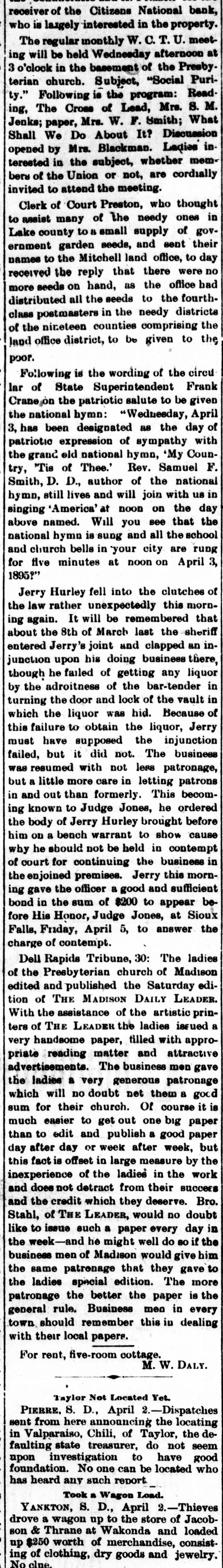 receiver of the Citizens National bank, who is lazgely interested in the property. The regular monthly W. C. T. U. meeting will be held Wednesday afternoon at 3 o'clock in the basement of the Presbyterian church. Subject, "Social Purity." Following is the program: Reading, The Cross of Lead, Mrs. S. M. Jenks; paper, Mrs. W. F. Smith; What Shall We Do About It? Discussion opened by Mrs. Blackman. Ladies interested in the subject, whether members of the Union or not, are cordially invited to attend the meeting. Clerk of Court Preston, who thought to assist many of the needy ones in Lake county to a small supply of government garden seeds, and sent their names to the Mitchell land office, to day received the reply that there were no more seeds on hand, as the office bad distributed all the seeds to the fourthclass postmasters in the needy districts of the nineteen counties comprising the land office district, to be given to the poor. Following is the wording of the circu lar of State Superintendent Frank Crane on the patriotic salute to be given the national hymn: "Wednesday, April 3, has been designated as the day of patriotic expression of sympathy with the grand old national hymn, 'My Country, "Tis of Thee.' Rev. Samuel F. Smith, D. D., author of the national hymn, still lives and will join with us in singing 'America' at noon on the day above named. Will you see that the national hymn is sung and all the school and church bells in 'your city are rung for five minutes at noon on April 3, 1895?" Jerry Hurley fell into the clutches of the law rather unexpectedly this morning again. It will be remembered that about the 8th of March last the sheriff entered Jerry's joint and clapped an injunction upon his doing business there, though he failed of getting any liquor by the adroitness of the bar-tender in turning the door and lock of the vault in which the liquor was hid. Because of this failure to obtain the liquor, Jerry must have supposed the injunction failed, but it did not. The business was resumed with not less patronage, but a little more care in letting patrons in and out than formerly. This becoming known to Judge Jones, he ordered the body of Jerry Hurley brought before him on a bench warrant to show cause why he should not be held in contempt of court for continuing the business in the enjoined premises. Jerry this morning gave the officer a good and sufficient bond in the sum of $200 to appear before His Honor, Judge Jones, at Sioux Falls, Friday, April 5, to answer the charge of contempt. Dell Rapids Tribune, 30: The ladies of the Presbyterian church of Madison edited and published the Saturday edition of THE MADISON DAILY LEADER. With the assistance of the artistic printers of THE LEADER the ladies issued a very handsome paper, filled with appropriate reading matter and attractive advertisements. The business men gave the ladies a very generous patronage which will no doubt net them a good sum for their church. Of course it is much easier to get out one big paper than to edit and publish a good paper day after day or week after week, but this fact is offset in large measure by the inexperience of the ladies in the work and does not detract from their success and the credit which they deserve. Bro. Stahl, of THE LEADER, would no doubt like to issue such a paper every day in the week-and he might well do so if the business men of Madison would give him the same patronage that they gave to the ladies special edition. The more patronage the better the paper is the general rule. Business men in every town should remember this in dealing with their local papers. For rent, five-room cottage. M. W. DALY. Taylor Not Located Yet. PIERRE. S. D., April 2.-Dispatches sent from here announcing the locating in Valparaiso, Chili, of Taylor, the defaulting state treasurer, do not seem upon investigation to have good foundation. No one can be located who has heard any such report Took a Wagon Load. YANKTON, S. D., April 2.-Thieves drove a wagon up to the store of Jacobson & Thrane at Wakonda and loaded up $250 worth of merchandise, consisting of clothing. drv goods and jewelry