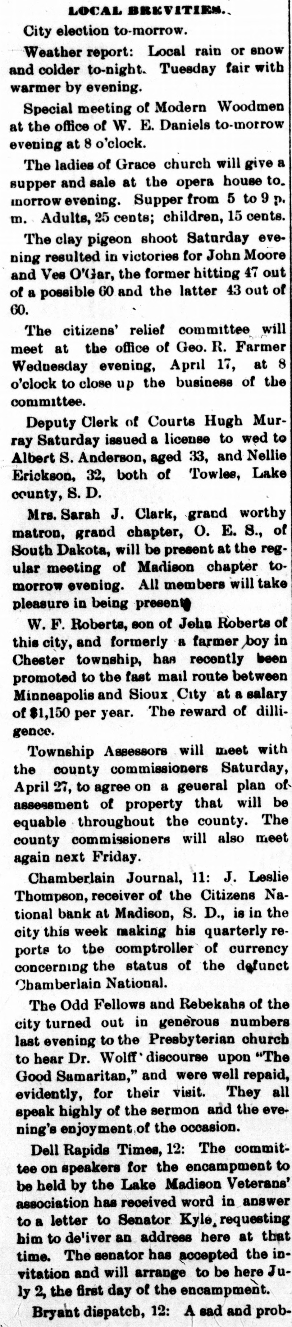 LOCAL BREVITIES. City election to-morrow. Weather report: Local rain or snow and colder to-night. Tuesday fair with warmer by evening. Special meeting of Modern Woodmen at the office of W. E. Daniels to-morrow evening at 8 o'clock. The ladies of Grace church will give a supper and sale at the opera house to. morrow evening. Supper from 5 to 9 p. m. Adults, 25 cents; children, 15 cents. The clay pigeon shoot Saturday evening resulted in victories for John Moore and Ves O'Gar, the former hitting 47 out of a possible 60 and the latter 43 out of 60. The citizens' relief committee will meet at the office of Geo. R. Farmer Wednesday evening, April 17, at 8 o'clock to close up the business of the committee. Deputy Clerk of Courts Hugh Murray Saturday issued a license to wed to Albert S. Anderson, aged 33, and Nellie Erickson, 32, both of Towles, Lake county, S. D. Mrs. Sarah J. Clark, grand worthy matron, grand chapter, O. E. S., of South Dakota, will be present at the regular meeting of Madison chapter tomorrow evening. All members will take pleasure in being present W. F. Roberts, son of John Roberts of this city, and formerly a farmer boy in Chester township, has recently been promoted to the fast mail route between Minneapolis and Sioux City at a salary of $1,150 per year. The reward of dilligence. Township Assessors will meet with the county commissioners Saturday, April 27, to agree on a geueral plan of assessment of property that will be equable throughout the county. The county commissioners will also meet again next Friday. Chamberlain Journal, 11: J. Leslie Thompson, receiver of the Citizens National bank at Madison, S. D., is in the city this week making his quarterly reports to the comptroller of currency concerning the status of the defunct Chamberlain National. The Odd Fellows and Rebekahs of the city turned out in genèrous numbers last evening to the Presbyterian church to hear Dr. Wolff` discourse upon "The Good Samaritan," and were well repaid, evidently, for their visit. They all speak highly of the sermon and the evening's enjoyment of the occasion. Dell Rapids Times, 12: The committee on speakers for the encampment to be held by the Lake Madison Veterans' association has received word in answer to a letter to Senator Kyle, requesting him to de'iver an address here at that time. The senator has accepted the invitation and will arrange to be here July 2, the first day of the encampment. Bryant dispatch, 12: A sad and prob-