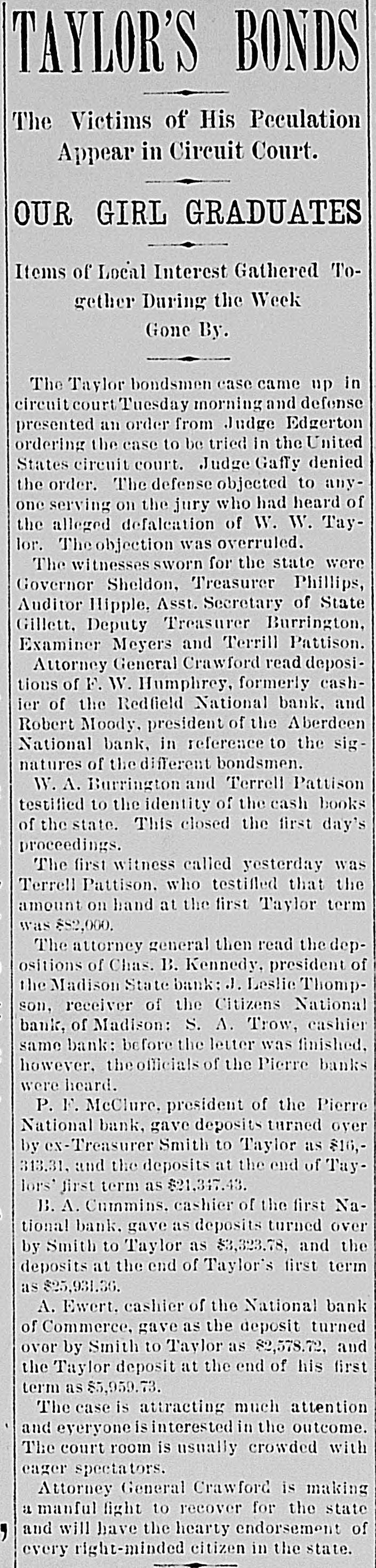 # TAYLOR'S BONDS The Victims of His Peculation Appear in Circuit Court. # OUR GIRL GRADUATES Items of Local Interest Gathered To- gether During the Week Gone By. The Taylor bondsmen case came up in circuit court Tuesday morning and defense presented an order from Judge Edgerton ordering the case to be tried in the United States circuit court. Judge Gafly denied the order. The defense objected to any- one serving on the jury who had heard of the alleged defalcation of W. W. Tay- lor. The objection was overruled. The witnesses sworn for the state were Governor Sheldon, Treasurer Phillips, Auditor Hipple, Asst. Secretary of State Gillett, Deputy Treasurer Burrington, Examiner Meyers and Terrill Pattison. Attorney General Crawford read deposi- tions of F. W. Humphrey, formerly cash- ier of the Redfield National bank, and Robert Moody, president of the Aberdeen National bank, in reference to the sig- natures of the different bondsmen. W. A. Barrington and Terrell Pattison testified to the identity of the cash books of the state. This closed the first day's proceedings. The first witness called yesterday was Terrell Pattison, who testified that the amount on hand at the first Taylor term was $82,000. The attorney general then read the dep- ositions of Chas. B. Kennedy, president of the Madison State bank; J. Leslie Thomp- son, receiver of the Citizens National bank, of Madison; S. A. Trow, cashier same bank; before the letter was finished, however, the officials of the Pierre banks were heard. P. F. McClure, president of the Pierre National bank, gave deposits turned over by ex-Treasurer Smith to Taylor as $16,- 313.31, and the deposits at the end of Tay- lors' first term as $21,347.43. B. A. Cummins, cashier of the first Na- tional bank, gave as deposits turned over by Smith to Taylor as $3,323.78, and the deposits at the end of Taylor's first term as $25,931.36. A. Ewert, cashier of the National bank of Commerce, gave as the deposit turned over by Smith to Taylor as $2,578.72, and the Taylor deposit at the end of his first term as $5,959.73. The case is attracting much attention and everyone is interested in the outcome. The court room is usually crowded with eager spectators. Attorney General Crawford is making a manful fight to recover for the state and will have the hearty endorsement of every right-minded citizen in the state.