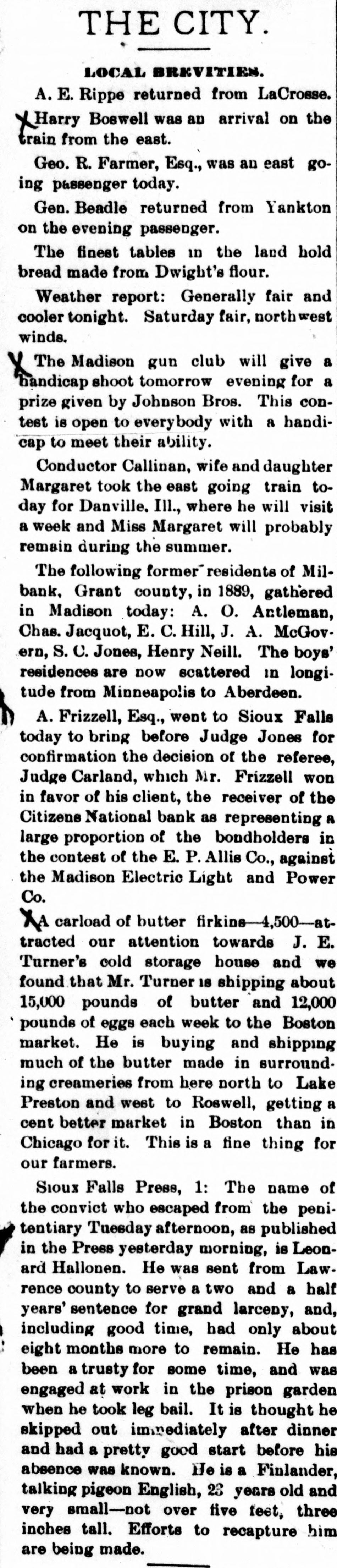 THE CITY. LOCAL BREVITIES. A. E. Rippe returned from LaCrosse. Harry Boswell was an arrival on the train from the east. Geo. R. Farmer, Esq., was an east going passenger today. Gen. Beadle returned from Yankton on the evening passenger. The finest tables in the land hold bread made from Dwight's flour. Weather report: Generally fair and cooler tonight. Saturday fair, northwest winds. The Madison gun club will give a handicap shoot tomorrow evening for a prize given by Johnson Bros. This contest is open to everybody with a handicap to meet their ability. Conductor Callinan, wife and daughter Margaret took the east going train today for Danville. Ill., where he will visit a week and Miss Margaret will probably remain during the summer. The following former residents of Milbank, Grant county, in 1889, gathered in Madison today: A. O. Antleman, Chas. Jacquot, E. C. Hill, J. A. McGovern, S. C. Jones, Henry Neill. The boys' residences are now scattered in longitude from Minneapolis to Aberdeen. A. Frizzell, Esq., went to Sioux Falls today to bring before Judge Jones for confirmation the decision of the referee, Judge Carland, which Mr. Frizzell won in favor of his client, the receiver of the Citizens National bank as representing a large proportion of the bondholders in the contest of the E. P. Allis Co., against the Madison Electric Light and Power Co. carload of butter firkins-4,500-attracted our attention towards J. E. Turner's cold storage house and we found that Mr. Turner IS shipping about 15,000 pounds of butter and 12,000 pounds of eggs each week to the Boston market. He is buying and shipping much of the butter made in surround. ing creameries from here north to Lake Preston and west to Roswell, getting a cent better market in Boston than in Chicago for it. This is a fine thing for our farmers. Sioux Falls Press, 1: The name of the convict who escaped from the penitentiary Tuesday afternoon, as published in the Press yesterday morning, is Leonard Hallonen. He was sent from Lawrence county to serve a two and a half years' sentence for grand larceny, and, including good time, had only about eight months more to remain. He has been a trusty for some time, and was engaged at work in the prison garden when he took leg bail. It is thought he skipped out immediately after dinner and had a pretty good start before his absence was known. He is a Finlander, talking pigeon English, 23 years old and very small-not over five feet, three inches tall. Efforts to recapture him are being made.