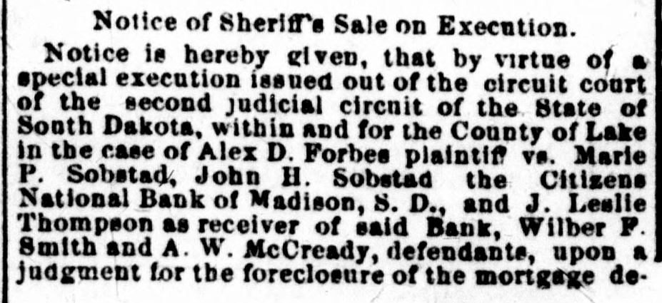 # Notice of Sheriff's Sale on Execution. Notice is hereby given, that by virtue of a special execution issued out of the circuit court of the second judicial circuit of the State of South Dakota, within and for the County of Lake in the case of Alex D. Forbes plaintif vs. Marie P. Sobstad, John H. Sobstad the Citizens National Bank of Madison, S. D., and J. Leslie Thompson as receiver of said Bank, Wilber P. Smith and A. W. McCready, defendants, upon a judgment for the foreclosure of the mortgage de-