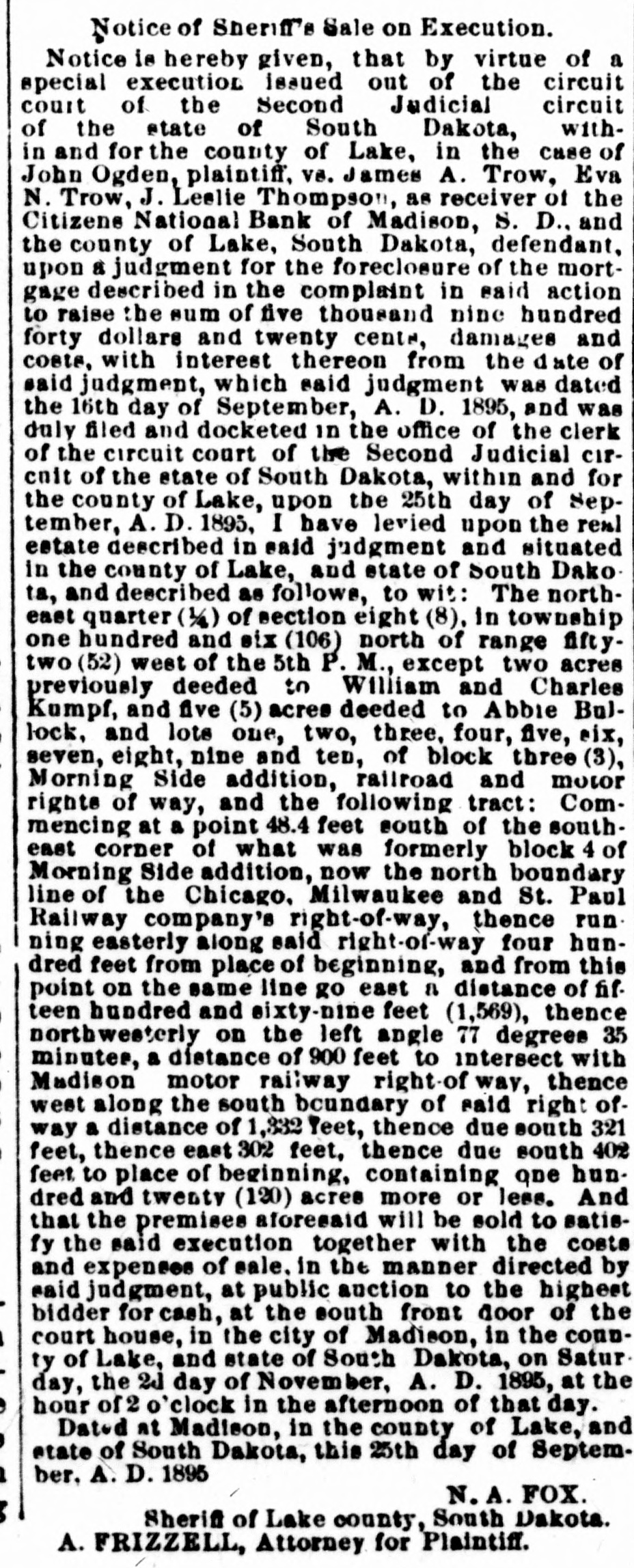 # Notice of Sheriff's Sale on Execution. Notice is hereby given, that by virtue of a special execution issued out of the circuit court of the Second Judicial circuit of the state of South Dakota, within and for the county of Lake, in the case of John Ogden, plaintiff, vs. James A. Trow, Eva N. Trow, J. Leelie Thompson, as receiver of the Citizens National Bank of Madison, S. D., and the county of Lake, South Dakota, defendant, upon a judgment for the foreclosure of the mortgage described in the complaint in said action to raise the sum of five thousand nine hundred forty dollars and twenty cents, damages and costs, with interest thereon from the date of said judgment, which said judgment was dated the 16th day of September, A. D. 1895, and was duly filed and docketed in the office of the clerk of the circuit court of the Second Judicial circuit of the state of South Dakota, within and for the county of Lake, upon the 25th day of September, A. D. 1895, I have levied upon the real estate described in said judgment and situated in the county of Lake, and state of South Dakota, and described as follows, to wit: The northeast quarter (¼) of section eight (8), in township one hundred and six (106) north of range fifty-two (52) west of the 5th P. M., except two acres previously deeded to William and Charles Kumpf, and five (5) acres deeded to Abbie Bullock, and lots one, two, three, four, five, six, seven, eight, nine and ten, of block three (3), Morning Side addition, railroad and motor rights of way, and the following tract: Commencing at a point 48.4 feet south of the southeast corner of what was formerly block 4 of Morning Side addition, now the north boundary line of the Chicago, Milwaukee and St. Paul Railway company's right-of-way, thence running easterly along said right-of-way four hundred feet from place of beginning, and from this point on the same line go east a distance of fifteen hundred and sixty-nine feet (1,569), thence northwesterly on the left angle 77 degrees 35 minutes, a distance of 900 feet to intersect with Madison motor railway right of way, thence west along the south boundary of said right of way a distance of 1,332 feet, thence due south 321 feet, thence east 302 feet, thence due south 402 feet to place of beginning, containing one hundred and twenty (120) acres more or less. And that the premises aforesaid will be sold to satisfy the said execution together with the costs and expenses of sale, in the manner directed by said judgment, at public auction to the highest bidder for cash, at the south front door of the court house, in the city of Madison, in the county of Lake, and state of South Dakota, on Saturday, the 2d day of November, A. D. 1895, at the hour of 2 o'clock in the afternoon of that day. Dated at Madison, in the county of Lake, and state of South Dakota, this 25th day of September. A. D. 1895 N. A. FOX. Sheriff of Lake county, South Dakota. A. FRIZZELL, Attorney for Plaintiff.