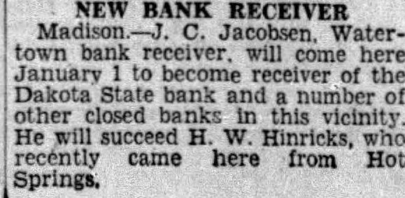NEW BANK RECEIVER Madison. Jacobsen. Watertown bank receiver. will come here January to become receiver of the Dakota State bank and number of other closed banks in this vicinity He will succeed H. W. Hinricks, who recently came here from Hot