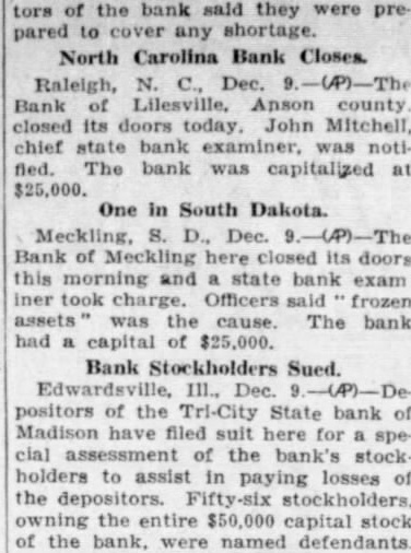 tors of the bank said they were prepared to cover any shortage. North Carolina Bank Closes. Raleigh, N. C., Dec. --(P)-The Bank Lilesville, Anson county closed its doors today. John Mitchell, chief state bank examiner, was notified. The bank was capitalized at $25,000. One in South Dakota. Meckling, S. D., Dec. Bank of Meckling closed its doors this morning and state bank exam iner took charge. Officers frozen assets was the cause. The bank had a capital of $25,000. Bank Stockholders Sued. III., Dec positors of the Tri-City State bank of Madison have filed suit for speclal of the bank's stock holders to assist in paying losses of owning the $50,000 capital stock of the bank, were named defendants