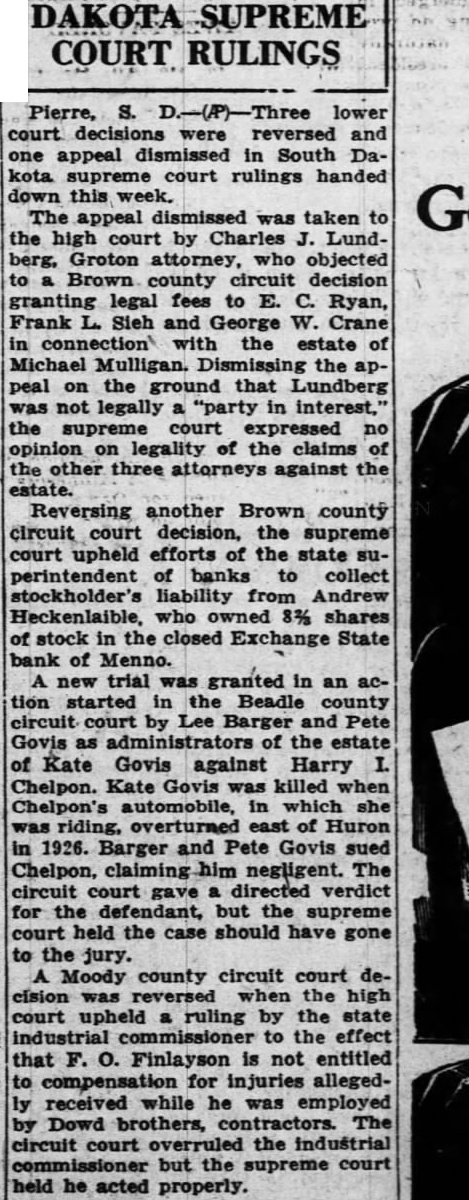 DAKOTA SUPREME COURT RULINGS Pierre, lower court were reversed and appeal dismissed in South Dakota supreme court rulings handed down this The appeal dismissed was taken the high court by Charles LundGroton attorney, who objected county circuit decision granting legal fees to E. Ryan, Frank and George Crane connection with estate Michael the appeal the ground Lundberg not legally "party in interest," the supreme court expressed opinion legality of the claims the other three attorneys against the estate. Reversing another Brown county circuit court decision, the supreme court upheld efforts of the state perintendent banks to collect stockholder's liability from Andrew Heckenlaible, who owned 8% shares stock in the closed Exchange State bank Menno. new trial was granted in action started in the Beadle county circuit court by Lee Barger and Govis as administrators of the estate Kate Govis against Harry Chelpon. Kate Govis killed when Chelpon's automobile, which she overturned of Huron 1926. Barger and Pete Govis sued Chelpon, claiming negligent. The circuit directed verdict the defendant, the supreme court held the should have gone the Moody county circuit court decision the high upheld ruling by the to the effect Finlayson is not entitled compensation for injuries allegedreceived while he was employed Dowd brothers, contractors. circuit court the industrial but the supreme court he acted properly.