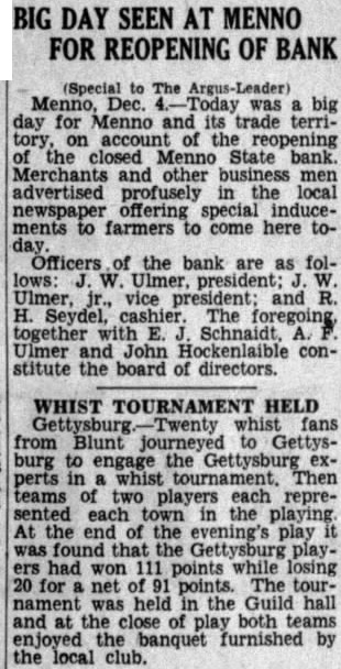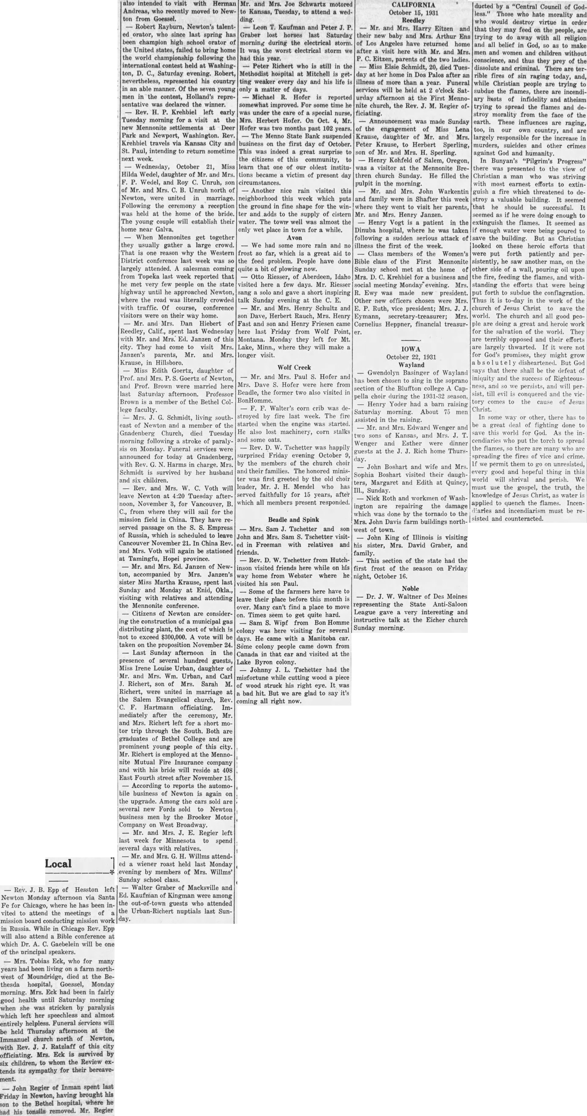 Local Rev. Epp of Hesston left Newton Monday afternoon via Santa Fe for Chicago, where he has been vited to attend the meetings of mission board conducting mission work in Russia. While in Chicago Rev. Epp will also attend Bible conference at which Dr. C. Gaebelein will be one of the principal speakers. Tobias Eck, who for many years been living on farm northwest of Moundridge, died at the Bethesda hospital, Goessel, Monday Mrs. Eck had been in fairly morning. health until Saturday morning good when she was stricken by paralysis which left her speechless and almost entirely helpless. Funeral services will be held Thursday afternoon at the Immanuel church north of Newton, Rev. Ratzlaff of this city with Mrs. Eck is survived by officiating. to whom the Review exsix children, for their bereavetends its sympathy ment. Regier of Inman spent last brought his Friday in Newton, having Bethel hospital, where to the tonsils removed. Mr. Regier his also intended to visit with Herman Andreas, who recently moved to Newton from Goessel. Robert Rayburn, Newton's talentorator, who since last spring has been champion high school orator of the United states, failed to bring home the world championship following the international contest held at WashingSaturday evening. Robert, nevertheless, represented his country in an able manner. Of the seven young men in the contest, Holland's representative was declared the winner. Rev. H. Krehbiel left early Tuesday morning for visit at the new Mennonite settlements at Deer Park and Newport, Washington. Rev. Krehbiel travels via Kansas City and St. Paul, intending to return sometime next week. Wednesday, October 21, Miss Hilda Wedel, daughter of Mr. and Mrs. Wedel, and Roy C. Unruh, son of and Mrs. Unruh north of Newton, were united in marriage. Following the reception ceremony held at the home of the bride. The couple will establish their young home near Galva. When Mennonites get together they usually gather large crowd. That is one reason why the Western District conference last week was largely attended. salesman coming from Topeka last week reported that he met very few people on the state highway until he approached Newton, where the road was literally crowded with traffic. Of conference course, visitors were on their way home. Mr. and Mrs. Dan Hiebert of Reedley, Calif., spent last Wednesday Mr. and Mrs. Ed. Janzen of this They had come to visit Mrs. Janzen's parents, Mr. and Mrs. Krause, in Hillsboro. Miss Edith Goertz, daughter of Prof. and Mrs. Goertz of Newton, and Prof. Brown were married here last Saturday afternoon. Professor Brown member of the Bethel College faculty. Schmidt, living southeast of Newton and member of the Gnadenberg Church, died Tuesday morning following stroke of paralyon Monday. Funeral services were announced for today at Gnadenberg, with Rev. Harms in charge. Mrs. Schmidt is survived by her husband and six children. Rev. and Mrs. W. C. Voth will leave Newton at 4:20 Tuesday afternoon, November for Vancouver, B. from where they will sail for the mission field in China. They have reserved on the Empress passage of Russia, which is scheduled to leave Cancouver November 21. In China Rev. and Mrs. Voth will again be stationed at Tamingfu, Hopei province. and Mrs. Ed. Janzen of accompanied by Mrs. Janzen's sister Miss Martha Krause, spent last Sunday and Monday at Enid, Okla., visiting with relatives and attending the Mennonite conference. Citizens of Newton are considerthe construction of municipal distributing plant, the cost of which not to exceed $300,000. vote will be taken on the proposition November 24. Last Sunday afternoon in the presence of several hundred guests, Miss Irene Louise Urban, daughter of Mr. and Mrs. Wm. Urban, and Carl Richert, son of Mrs. Sarah Richert, were united in marriage at the Salem Evangelical church, Rev. Hartmann officiating. Immediately after the ceremony, Mr. and Mrs. Richert left for short motor trip through the South. Both are graduates of Bethel College and are prominent young people of this city. Mr. Richert is employed the Mennonite Mutual Fire Insurance company and with his bride will reside at 408 East Fourth street after November 15. According reports the automobile business of Newton is again on the upgrade. Among the cars sold are several new Fords sold to Newton business men by the Brooker Motor Company on West Broadway. Mr. and Mrs. Regier left last week for Minnesota to spend several days with relatives. and Mrs. Willms attendwiener roast held last Monday evening by members of Mrs. Willms' Sunday school class. Walter Graber of Macksville and Kaufman of Kingman were among the out-of-town guests who attended the nuptials last Sunday. Mr. and Mrs. Joe Schwartz motored to Kansas, Tuesday, to attend wedding. Leon Kaufman and Peter Graber lost horses last Saturday morning during the electrical storm. was the worst electrical storm we had this year. Peter Richert who is still in the Methodist hospital at Mitchell is getting weaker every day and his life only matter of days. Michael R. Hofer is reported somewhat improved. For some time he was under the care of special nurse, Mrs. Herbert Hofer. On Oct. Mr. Hofer was two months past 102 years. The Menno State Bank suspended business on the first day of October. This was indeed great surprise to the citizens of this community, to learn that one of our oldest institutions became victim of present day circumstances. Another nice rain visited this neighborhood this week which puts the ground in fine shape for the ter and adds to the supply of cistern water. The town well was almost the only wet place in town for while. Avon We had some more rain and no frost so far, which is great aid the feed problem. People have done quite of plowing now. Otto Riesser, of Aberdeen, Idaho visited here few days. Mr. Riesser sang solo and short inspiring gave talk Sunday evening at the and Mrs. Henry Schultz and son Dave, Herbert Rauch, Mrs. Henry Fast and son and Henr