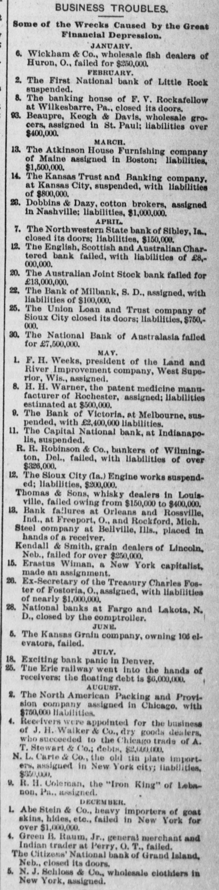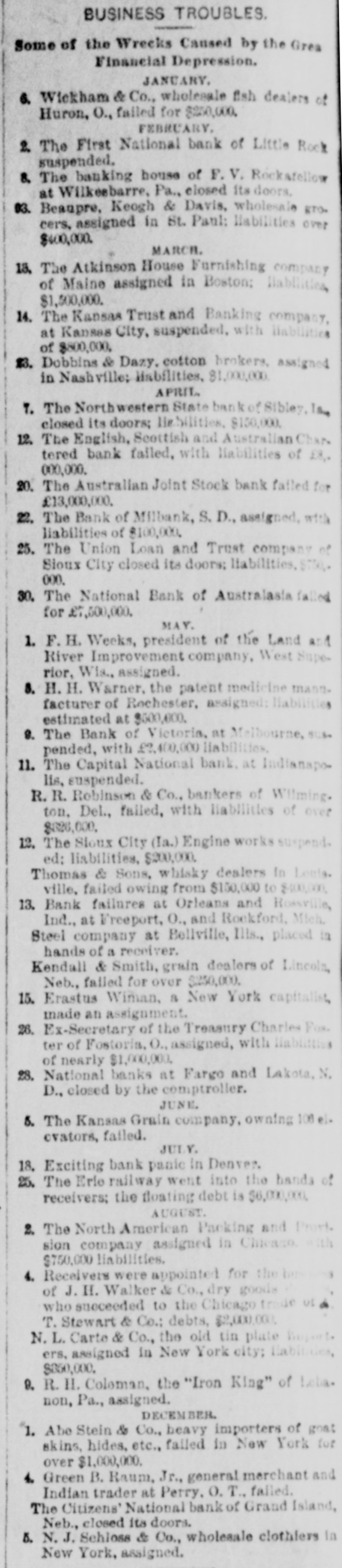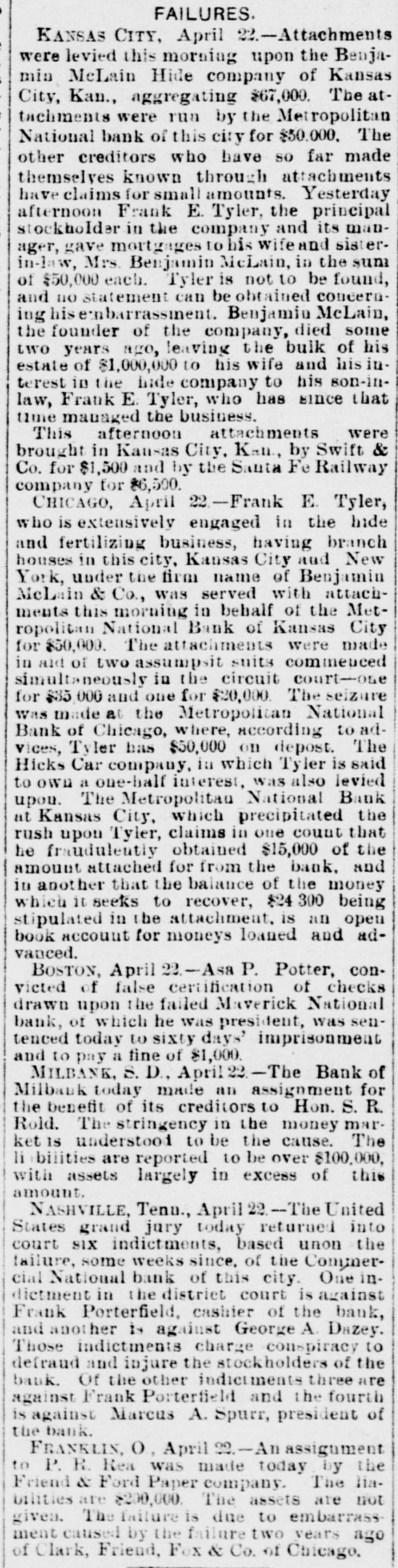 FAILURES. KANSAS CITY, April 22.-Attachments were levied this morning upon the Benjamin McLain Hide company of Kansas City, Kan., aggregating $67,000. The attachments were run by the Metropolitan National bank of this city for $50.000. The other creditors who have so far made themselves known through attachments have claims for small amounts. Yesterday afternoon Frank E. Tyler, the principal stockholder in the company and its manager, gave mortgages to his wife and sisterin-law, Mrs. Benjamin McLain, in the sum of $50,000 each. Tyler is not to be found, and no statement can be obtained concerning his enbarrassment. Benjamiu McLain, the founder of the company, died some two years ago, leaving the bulk of his estate of $1,000,000 to his wife and his interest in the hide company to his son-inlaw, Frank E. Tyler, who has since that time managed the business. This afternoon attachments were brought in Kansas City, Kan, by Swift & Co. for $1,500 and by the Santa Fe Railway company for $6,500. CHICAGO, April 22.-Frank E. Tyler, who is extensively engaged in the hide and fertilizing business, having branch houses in this city, Kansas City and New York, under the firm name of Benjamin McLain & Co., was served with attachments this morning in behalf of the Metropolitan National Bank of Kansas City for $50,000. The attachments were made in and of two assumpsit suits commenced simultaneously in the circuit court-one for $35.0 and one for $20,000. The seizure was made at the Metropolitan National Bank of Chicago, where, according to adhas $50,000 on vices, Tyler depost. The Hicks Car company, in which Tyler is said to own a one-half interest. was also levied upon. The Metropolitan National Bank at Kansas City, which precipitated the rush upon Tyler, claims in one count that he fraudulently obtained $15,000 of the amount attached for from the bank. and in another that the balance of the money which it seeks to recover, $24 300 being stipulated in the attachment. is an open book account for moneys loaned and advanced. BOSTON, April 22.-Asa P. Potter, convicted of false certification of checks drawn upon the failed Maverick National bank, of which he was president, was sentenced today to sixty days' imprisonment and to pay a fine of $1,000. MILBANK, S. D. April 22.-The Bank of Milbauk today made an assignment for the benefit of its creditors to Hon. S.R. Rold. The stringency in the money market IS understood to be the cause. The li bilities are reported to be over $100,000, with assets largely in excess of this amount. NASHVILLE, Tenu., April e-The United States grand jury today returned into court SIX indictments, based unon the tailure, some weeks since, of the Commercial National bank of this city. One indietment in the district court is against Frank Porterfield, cashier of the bank, and another is against George A. Dazey. Those indictments charge conspiracy to defraud and injure the stockholders of the bank. Of the other indictments three are against Frank Porterfield and the fourth is against Marcus A. Spurr, president of the bank. FRANKLIN, O. April 22.-An assignment to P. R. Rea was made today by the Friend & Ford Paper company. The liabilities are $200,000. The assets are not given. The failure is due to embarrass ment caused by the failure two years ago of Clark, Friend, Fox & Co. of Chicago.