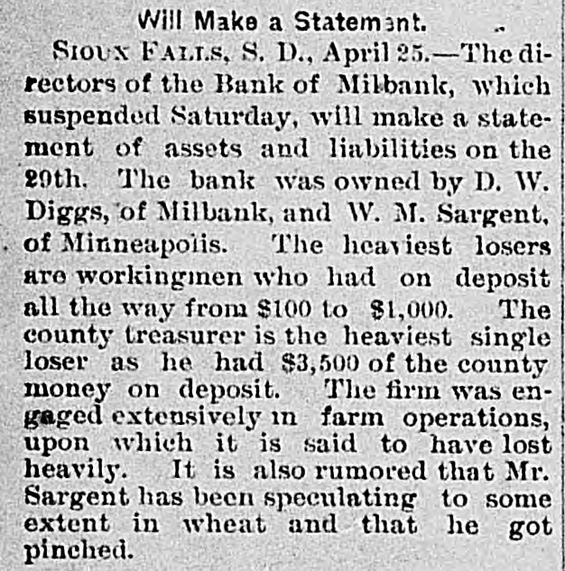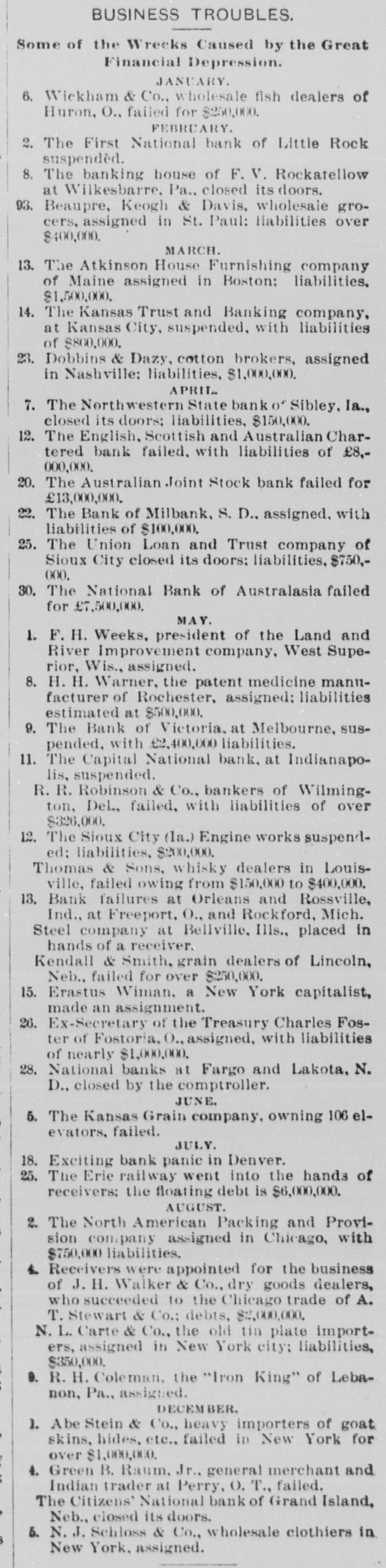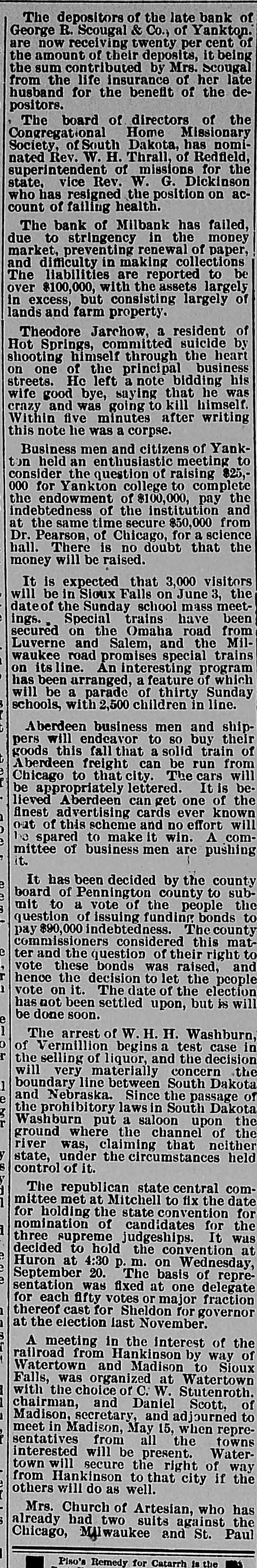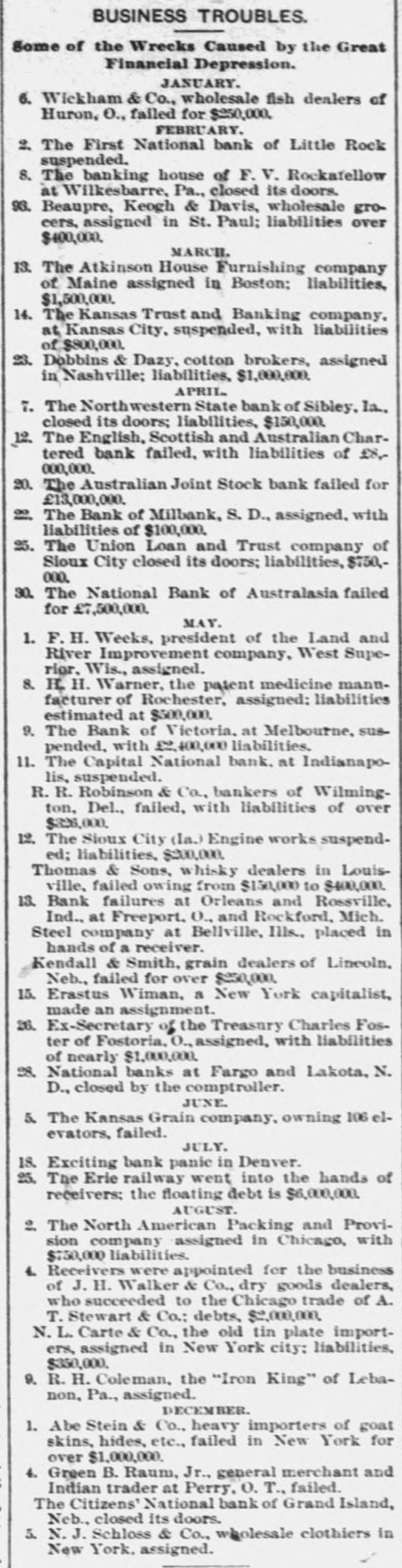 FAILURES. KANSAS CITY, April 22.-Attachments were levied this morning upon the Benjamin McLain Hide company of Kansas City, Kan., aggregating $67,000. The attachments were run by the Metropolitan National bank of this city for $50.000. The other creditors who have so far made themselves known through attachments have claims for small amounts. Yesterday afternoon Frank E. Tyler, the principal stockholder in the company and its manager, gave mortgages to his wife and sisterin-law, Mrs. Benjamin McLain, in the sum of $50,000 each. Tyler is not to be found, and no statement can be obtained concerning his enbarrassment. Benjamiu McLain, the founder of the company, died some two years ago, leaving the bulk of his estate of $1,000,000 to his wife and his interest in the hide company to his son-inlaw, Frank E. Tyler, who has since that time managed the business. This afternoon attachments were brought in Kansas City, Kan, by Swift & Co. for $1,500 and by the Santa Fe Railway company for $6,500. CHICAGO, April 22.-Frank E. Tyler, who is extensively engaged in the hide and fertilizing business, having branch houses in this city, Kansas City and New York, under the firm name of Benjamin McLain & Co., was served with attachments this morning in behalf of the Metropolitan National Bank of Kansas City for $50,000. The attachments were made in and of two assumpsit suits commenced simultaneously in the circuit court-one for $35.0 and one for $20,000. The seizure was made at the Metropolitan National Bank of Chicago, where, according to adhas $50,000 on vices, Tyler depost. The Hicks Car company, in which Tyler is said to own a one-half interest. was also levied upon. The Metropolitan National Bank at Kansas City, which precipitated the rush upon Tyler, claims in one count that he fraudulently obtained $15,000 of the amount attached for from the bank. and in another that the balance of the money which it seeks to recover, $24 300 being stipulated in the attachment. is an open book account for moneys loaned and advanced. BOSTON, April 22.-Asa P. Potter, convicted of false certification of checks drawn upon the failed Maverick National bank, of which he was president, was sentenced today to sixty days' imprisonment and to pay a fine of $1,000. MILBANK, S. D. April 22.-The Bank of Milbauk today made an assignment for the benefit of its creditors to Hon. S.R. Rold. The stringency in the money market IS understood to be the cause. The li bilities are reported to be over $100,000, with assets largely in excess of this amount. NASHVILLE, Tenu., April e-The United States grand jury today returned into court SIX indictments, based unon the tailure, some weeks since, of the Commercial National bank of this city. One indietment in the district court is against Frank Porterfield, cashier of the bank, and another is against George A. Dazey. Those indictments charge conspiracy to defraud and injure the stockholders of the bank. Of the other indictments three are against Frank Porterfield and the fourth is against Marcus A. Spurr, president of the bank. FRANKLIN, O. April 22.-An assignment to P. R. Rea was made today by the Friend & Ford Paper company. The liabilities are $200,000. The assets are not given. The failure is due to embarrass ment caused by the failure two years ago of Clark, Friend, Fox & Co. of Chicago.