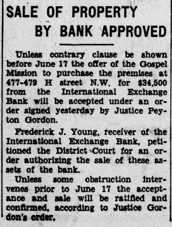 SALE OF PROPERTY BY BANK APPROVED Unless contrary clause be shown before June 17 the offer of the Gospel Mission to purchase the premises at 477-479 H street N.W. for $34,500 from the International Exchange Bank will be accepted under an order signed yesterday by Justice Peyton Gordon. Frederick J. Young, receiver of the International Exchange Bank, petitioned the District Court for an order authorizing the sale of these assets of the bank. Unless some obstruction intervenes prior to June 17 the acceptance and sale will be ratified and confirmed, according to Justice Gordon's order.