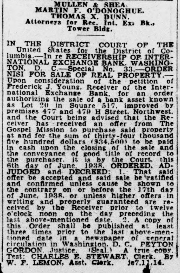 MULLEN & SHEA. MARTIN F. O'DONOGHUE. THOMAS X. DUNN. Attorneys for Rec. Int. Ex: Bk., Tower Bldg. IN THE DISTRICT COURT OF THE United States for the District of Columbia.-- re RECEIVERSHIP OF INTERNATIONAL EXCHANGE BANK. WASHINGTON. D. C. Special No. 33.-ORDER NISI FOR SALE OF REAL PROPERTY.Upon consideration of the petition of Frederick J. Young, Receiver of the International Exchange Bank. for an order authorizing the sale of a bank asset known as Lot 20 in Square 517, improved by premises 477 and 479 H Street. Northwest. and the Court being advised that the Receiver has received an offer from The Gospel Mission to purchase said property at and for the sum of thirty-four thousand five hundred dollars ($34,500) to be paid in cash upon the closing of the sale and the conveyance of good title of record to the purchaser. it is by the Court. this 6th day of June, 1938. ORDERED. ADJUDGED and DECREED: 1. That said offer be accepted and said sale be ratified and confirmed unless cause be shown to the contrary on or before the 17th day of June, 1938. or unless higher offers in writing and properly guaranteed are received by the Receiver prior to twelve o'clock noon on the day preceding the last above-mentioned date. 2. A copy of this Order shall be published at least three times prior to the last above-mentioned date in a newspaper of ceneral circulation in Washington. D. C. PEYTON GORDON. Justice. (Seal.) A true copy. Test: CHARLES E. STEWART. Clerk. By W. F. LEMON, Asst. Clerk. je7.11.14.