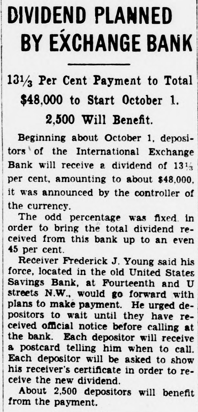 DIVIDEND PLANNED BY EXCHANGE BANK 131/3 Per Cent Payment to Total $48,000 to Start October 1. 2,500 Will Benefit. Beginning about October 1. depositors 1 of the International Exchange Bank will receive a dividend of 131/3 per cent, amounting to about $48,000. it was announced by the controller of the currency. The odd percentage was fixed in order to bring the total dividend received from this bank up to an even 45 per cent. Receiver Frederick J. Young said his force, located in the old United States Savings Bank, at Fourteenth and U streets N.W., would go forward with plans to make payment. He urged depositors to wait until they have received official notice before calling at the bank. Each depositor will receive a postcard telling him when to call. Each depositor will be asked to show his receiver's certificate in order to receive the new dividend. About 2,500 depositors will benefit from the payment.