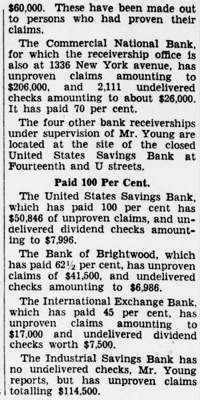 $60,000. These have been made out to persons who had proven their claims. The Commercial National Bank, for which the receivership office is also at 1336 New York avenue, has unproven claims amounting to $206,000, and 2,111 undelivered checks amounting to about $26,000. It has paid 70 per cent. The four other bank receiverships under supervision of Mr. Young are located at the site of the closed United States Savings Bank at Fourteenth and U streets. Paid 100 Per Cent. The United States Savings Bank, which has paid 100 per cent has $50,846 of unproven claims, and undelivered dividend checks amounting to $7,996. The Bank of Brightwood, which has paid 62 1/2 per cent, has unproven claims of $41,500, and undelivered checks amounting to $6,986. The International Exchange Bank, which has paid 45 per cent, has unproven claims amounting to $17,000 and undelivered dividend checks worth $7,500. The Industrial Savings Bank has no undelivered checks, Mr. Young reports, but has unproven claims totalling $114,500.
