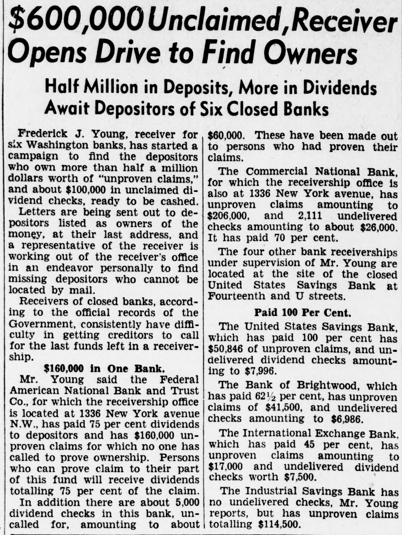 $600,000Unclaimed,Receiver Opens Drive to Find Owners Half Million in Deposits, More in Dividends Await Depositors of Six Closed Banks Frederick J. Young, receiver for $60,000. These have been made out six Washington banks, has started a to persons who had proven their claims. campaign to find the depositors who own more than half a million The Commercial National Bank, dollars worth of "unproven claims," for which the receivership office is and about $100,000 in unclaimed dialso at 1336 New York avenue, has vidend checks, ready to be cashed. unproven claims amounting to Letters are being sent out to de$206,000, and 2,111 undelivered positors listed as owners of the checks amounting to about $26,000. money, at their last address, and It has paid 70 per cent. a representative of the receiver is The four other bank receiverships working out of the receiver's office under supervision of Mr. Young are in an endeavor personally to find located at the site of the closed missing depositors who cannot be United States Savings Bank at located by mail. Fourteenth and U streets. Receivers of closed banks, accordPaid 100 Per Cent. ing to the official records of the Government, consistently have diffiThe United States Savings Bank, culty in getting creditors to call which has paid 100 per cent has for the last funds left in a receiver$50,846 of unproven claims, and unship. delivered dividend checks amount$160,000 in One Bank. ing to $7,996. Mr. Young said the Federal The Bank of Brightwood, which American National Bank and Trust has paid 62 1/2 per cent, has unproven Co., for which the receivership office claims of $41,500, and undelivered is located at 1336 New York avenue checks amounting to $6,986. N.W., has paid 75 per cent dividends The International Exchange Bank, to depositors and has $160,000 unwhich has paid 45 per cent, has proven claims for which no one has unproven claims amounting to called to prove ownership. Persons $17,000 and undelivered dividend who can prove claim to their part checks worth $7,500. of this fund will receive dividends totalling 75 per cent of the claim. The Industrial Savings Bank has In addition there are about 5,000 no undelivered checks, Mr. Young dividend checks in this bank, unreports, but has unproven claims totalling $114,500. called for, amounting to about