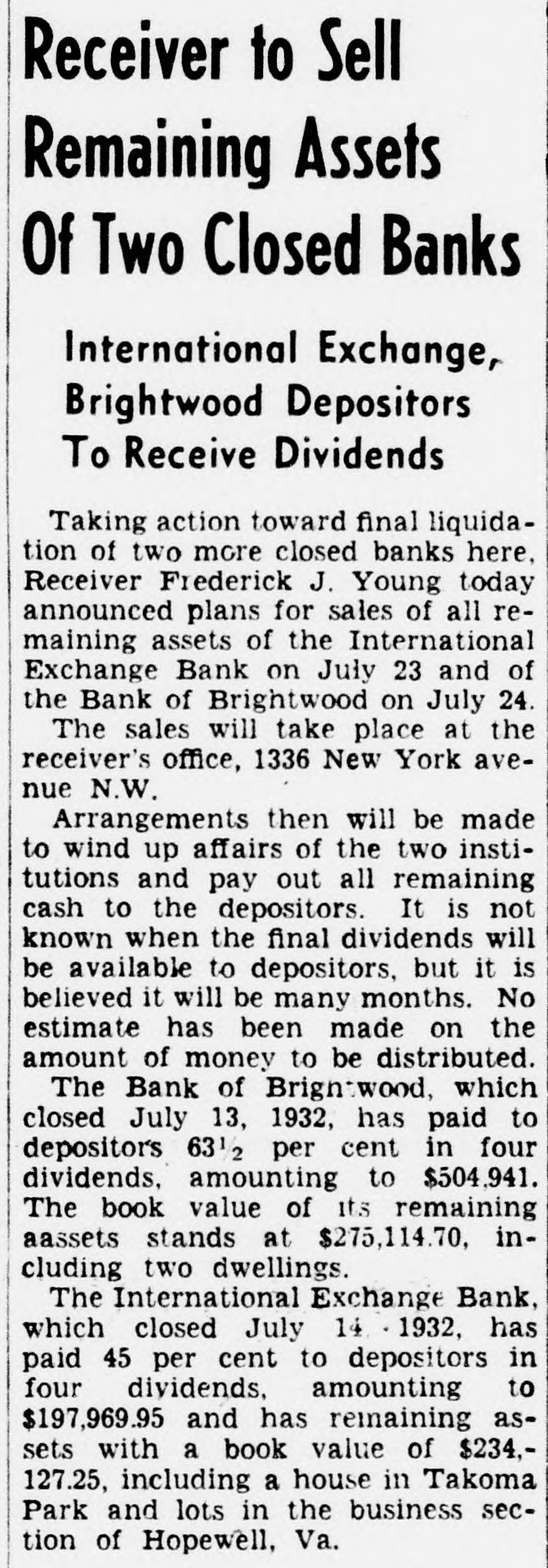 Receiver to Sell Remaining Assets Of Two Closed Banks International Exchange, Brightwood Depositors To Receive Dividends Taking action toward final liquidation of two more closed banks here, Receiver Frederick J. Young today announced plans for sales of all remaining assets of the International Exchange Bank on July 23 and of the Bank of Brightwood on July 24. The sales will take place at the receiver's office, 1336 New York avenue N.W. Arrangements then will be made to wind up affairs of the two institutions and pay out all remaining cash to the depositors. It is not known when the final dividends will be available to depositors, but it is believed it will be many months. No estimate has been made on the amount of money to be distributed. The Bank of Brightwood, which closed July 13, 1932, has paid to depositors 63 1/2 per cent in four dividends, amounting to $504.941. The book value of its remaining aassets stands at $275,114.70, including two dwellings. The International Exchange Bank, which closed July 14 . 1932, has paid 45 per cent to depositors in four dividends, amounting to $197,969.95 and has remaining assets with a book value of $234,127.25, including a house in Takoma Park and lots in the business section of Hopewell, Va.