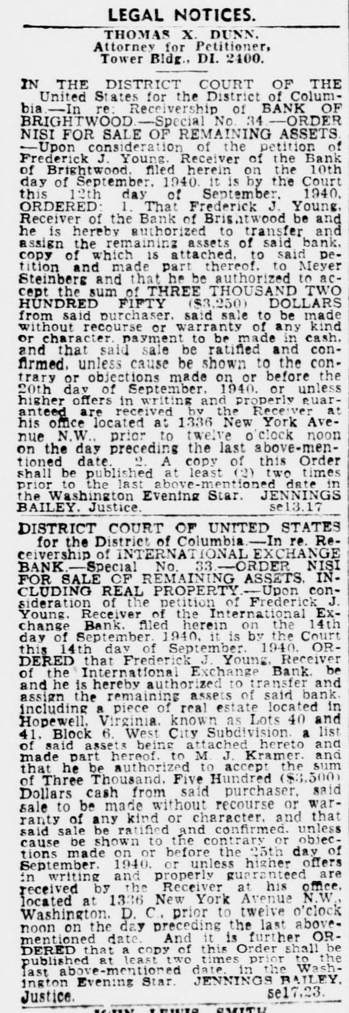 LEGAL NOTICES. THOMAS X. DUNN. Attorney for Petitioner, Tower Bldg., DI. 2400. IN THE DISTRICT COURT OF THE United States for the District of Columbia.-In re: Receivership of BANK OF BRIGHTWOOD.-Special No. 34 -ORDER NISI FOR SALE OF REMAINING ASSETS. -Upon consideration of the petition of Frederick J. Young. Receiver of the Bank of Brightwood. filed herein on the 10th day of September. 1940. it is by the Court this 12th day of September. 1940. ORDERED: 1. That Frederick J. Young, Receiver of the Bank of Brishtwood be and he is hereby authorized to transfer and assign the remaining assets of said bank. copy of which 18 attached, to said petition and made part thereof. to Meyer Steinberg and that he be authorized to accept the sum of THREE THOUSAND TWO HUNDRED FIFTY ($3,250) DOLLARS from said purchaser. said sale to be made without recourse or warranty of any kind or character. payment to be made in cash. and that said sale be ratified and confirmed. unless cause be shown to the contrary or objections made on or before the 20th day of September. 1940. or unless higher offers in writing and properly Ruaranteed are received by the Receiver at his office located at 1336 New York Avenue N.W., prior to twelve o'clock noon on the day preceding the last above-mentioned date. 2. A copy of this Order shall be published at least (2) two times prior to the last above-mentioned date in the Washington Evening Star. JENNINGS se13.17 BAILEY. Justice. DISTRICT COURT OF UNITED STATES for the District of Columbia.- In re. Receivership of INTERNAT IONAL EXCHANGE BANK.-Special No. 33.-ORDER NISI FOR SALE OF REMAINING ASSETS. INCLUDING REAL PROPERTY.-Upon consideration of the petition of Frederick J. Young, Receiver of the International Exchange Bank. filed herein on the 14th day of September. 1940, it is by the Court this 14th day of September. 1940. ORDERED that Frederick J. Young, Receiver of the International Exchange Bank. be and he is hereby authorized to transfer and assign the remaining assets of said bank. including a piece of real estate located in Hopewell, Virginia. known as Lots 40 and 41. Block 6. West City Subdivision. a list of said assets being attached hereto and made part hereof. to M. J. Kramer. and that he be authorized to accept the sum of Three Thousand. Five Hundred ($3,500) Dollars cash from said purchaser. said sale to be made without recourse or warranty of any kind or character. and that said sale be ratified and confirmed. unless cause be shown to the contrary or objections made on or before the 25th day of September. 1940. or unless higher offers in writing and properly guaranteed are received by the Receiver at his office, located at 1336 New York Avenue N.W., Washington. D. C., prior to twelve o'clock noon on the day preceding the last abovementioned date. And it is further ORDERED that a CODY of this Order shall be published at least two times prior to the last above-mentioned date. in the Washington Evening Star. JENNINGS BAILEY, se17.23. Justice.