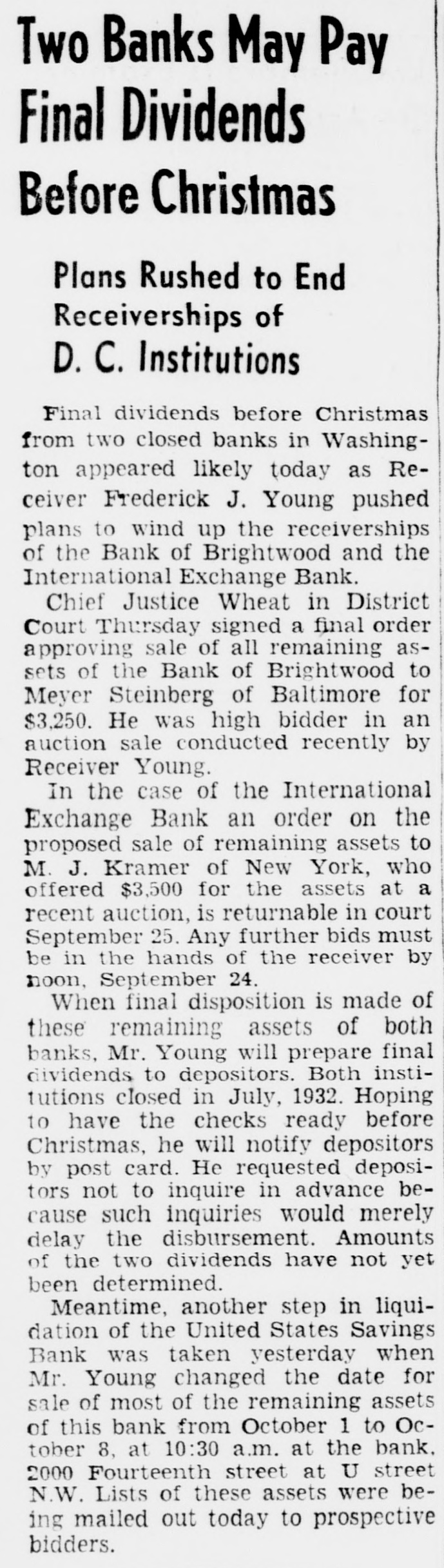 Two Banks May Pay Final Dividends Before Christmas Plans Rushed to End Receiverships of D. C. Institutions Final dividends before Christmas from two closed banks in Washington appeared likely today as Receiver Frederick J. Young pushed plans to wind up the receiverships of the Bank of Brightwood and the International Exchange Bank. Chief Justice Wheat in District Court Thursday signed a final order approving sale of all remaining assets of the Bank of Brightwood to Meyer Steinberg of Baltimore for $3,250. He was high bidder in an auction sale conducted recently by Receiver Young. In the case of the International Exchange Bank an order on the proposed sale of remaining assets to M. J. Kramer of New York, who offered $3,500 for the assets at a recent auction, is returnable in court September 25. Any further bids must be in the hands of the receiver by noon, September 24. When final disposition is made of these remaining assets of both banks, Mr. Young will prepare final dividends to depositors. Both institutions closed in July, 1932. Hoping to have the checks ready before Christmas, he will notify depositors by post card. He requested depositors not to inquire in advance because such inquiries would merely delay the disbursement. Amounts of the two dividends have not yet been determined. Meantime, another step in liquidation of the United States Savings Bank was taken yesterday when Mr. Young changed the date for sale of most of the remaining assets of this bank from October 1 to October 8, at 10:30 a.m. at the bank. 2000 Fourteenth street at U street N.W. Lists of these assets were being mailed out today to prospective bidders.