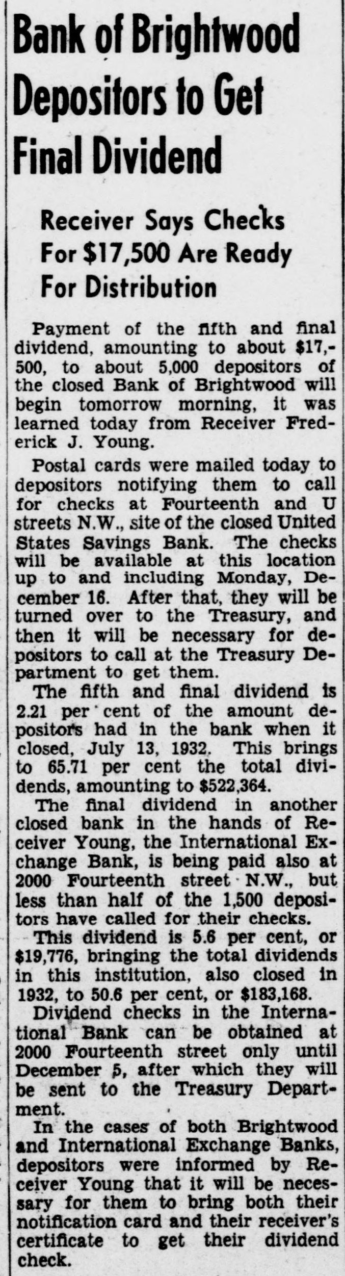 Bank of Brightwood Depositors to Get Final Dividend Receiver Says Checks For $17,500 Are Ready For Distribution Payment of the fifth and final dividend, amounting to about $17,500, to about 5,000 depositors of the closed Bank of Brightwood will begin tomorrow morning, it was learned today from Receiver Frederick J. Young. Postal cards were mailed today to depositors notifying them to call for checks at Fourteenth and U streets N.W., site of the closed United States Savings Bank. The checks will be available at this location up to and including Monday, December 16. After that, they will be turned over to the Treasury, and then it will be necessary for depositors to call at the Treasury Department to get them. The fifth and final dividend is 2.21 per cent of the amount depositors had in the bank when it closed, July 13, 1932. This brings to 65.71 per cent the total dividends, amounting to $522,364. The final dividend in another closed bank in the hands of Receiver Young, the International Exchange Bank, is being paid also at 2000 Fourteenth street N.W., but less than half of the 1,500 depositors have called for their checks. This dividend is 5.6 per cent, or $19,776, bringing the total dividends in this institution, also closed in 1932, to 50.6 per cent, or $183,168. Dividend checks in the International Bank can be obtained at 2000 Fourteenth street only until December 5, after which they will be sent to the Treasury Department. In the cases of both Brightwood and International Exchange Banks, depositors were informed by Receiver Young that it will be necessary for them to bring both their notification card and their receiver's certificate to get their dividend check.