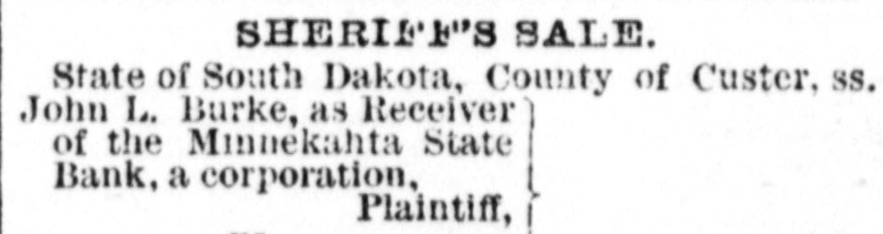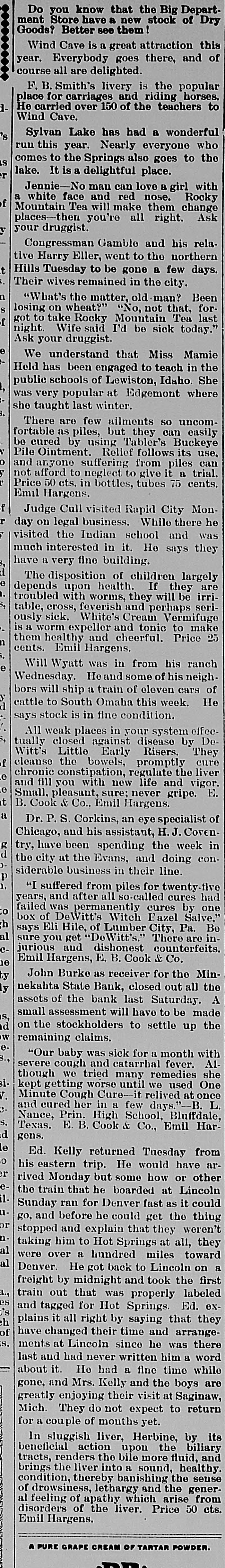 Do you know that the Big Department Store have a new stock of Dry Goods? Better see them! Wind Cave is a great attraction this year. Everybody goes there, and of course all are delighted. F. B. Smith's livery is the popular place for carriages and riding horses. He carried over 150 of the teachers to Wind Cave. Sylvan Lake has had a wonderful run this year. Nearly everyone who comes to the Springs also goes to the lake. It is a delightful place. Jennie-No man can love a girl with a white face and red nose. Rocky Mountain Tea will make them change places-then you're all right. Ask your druggist. Congressman Gamble and his relative Harry Eller, went to the northern Hills Tuesday to be gone a few days. Their wives remained in the city. "What's the matter, old man? Been losing on wheat?" "No, not that, forgot to take Rocky Mountain Tea last night. Wife said I'd be sick today." Ask your druggist. We understand that Miss Mamie Held has been engaged to teach in the public schools of Lewiston, Idaho. She was very popular at Edgemont where she taught last winter. There are few ailments so uncomfortable as piles, but they can easily be cured by using Tabler's Buckeye Pile Ointment. Relief follows its use, and anyone suffering from piles can not afford to neglect to give it a trial. Price 50 cts. in bottles, tubes 75 cents. Emil Hargens. Judge Cull visited Rapid City Monday on legal business. While there he visited the Indian school and was much interested in it. He says they have a very fine building. The disposition of children largely depends upon health. If they are troubled with worms, they will be irritable, cross, feverish and perhaps seriously sick. White's Cream Vermifuge is a worm expeller and tonic to make them healthy and cheerful. Price 25 cents. Emil Hargens. Will Wyatt was in from his ranch Wednesday. He and some of his neighbors will ship a train of eleven cars of cattle to South Omaha this week. He says stock is in fine condition. All weak places in your system effectually closed against disease by DeWitt's Little Early Risers. They cleanse the bowels, promptly cure chronic constipation, regulate the liver and fill you with new life and vigor. Small, pleasant, sure; never gripe. E. B. Cook & Co., Emil Hargens. Dr. P. S. Corkins, an eye specialist of Chicago, and his assistant, H. J. Coventry, have been spending the week in the city at the Evans, and doing considerable business in their line. "I suffered from piles for twenty-five years, and after all so-called cures had failed was permanently cures by one box of DeWitt's Witch Fazel Salve," says Eli Hile, of Lumber City, Pa. Be sure you get "DeWitt's." There are injurious and dishonest counterfeits. Emil Hargens, E. B. Cook & Co. John Burke as receiver for the Minnekahta State Bank, closed out all the assets of the bank last Saturday. A small assessment will have to be made on the stockholders to settle up the remaining claims. "Our baby was sick for a month with severe cough and catarrhal fever. Although we tried many remedies she kept getting worse until we used One Minute Cough Cure-it relived at once and cured her in a few days."-B. L. Nance, Prin. High School, Bluffdale, Texas. E. B. Cook & Co., Emil Hargens. Ed. Kelly returned Tuesday from his eastern trip. He would have arrived Monday but some how or other the train that he boarded at Lincoln Sunday ran for Denver fast as it could go, and before he could get the thing stopped and explain that they weren't taking him to Hot Springs at all, they were over a hundred miles toward Denver. He got back to Lincoln on a freight by midnight and took the first train out that was properly labeled and tagged for Hot Springs. Ed. explains it all right by saying that they have changed their time and arrangements at Lincoln since he was there last and had never written him a word about it. He had a fine time while gone, and Mrs. Kelly and the boys are greatly enjoying their visit at Saginaw, Mich. They do not expect to return for a couple of months yet. In sluggish liver, Herbine, by its beneficial action upon the biliary tracts, renders the bile more fluid, and brings the liver into a sound, healthy condition, thereby banishing the sense of drowsiness, lethargy and the general feeling of apathy which arise from disorders of the liver. Price 50 cts. Emil Hargens. A PURE GRAPE CREAM OF TARTAR POWDER.
