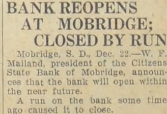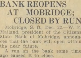 BANK REOPENS AT MOBRIDGE; CLOSED BY RUN Mobridge, S. D., Dec. F Mailand. president of the Citizens State Bank of Mobridge, announces that the bank will open within the near future. A run on the bank some time ago caused it to close.