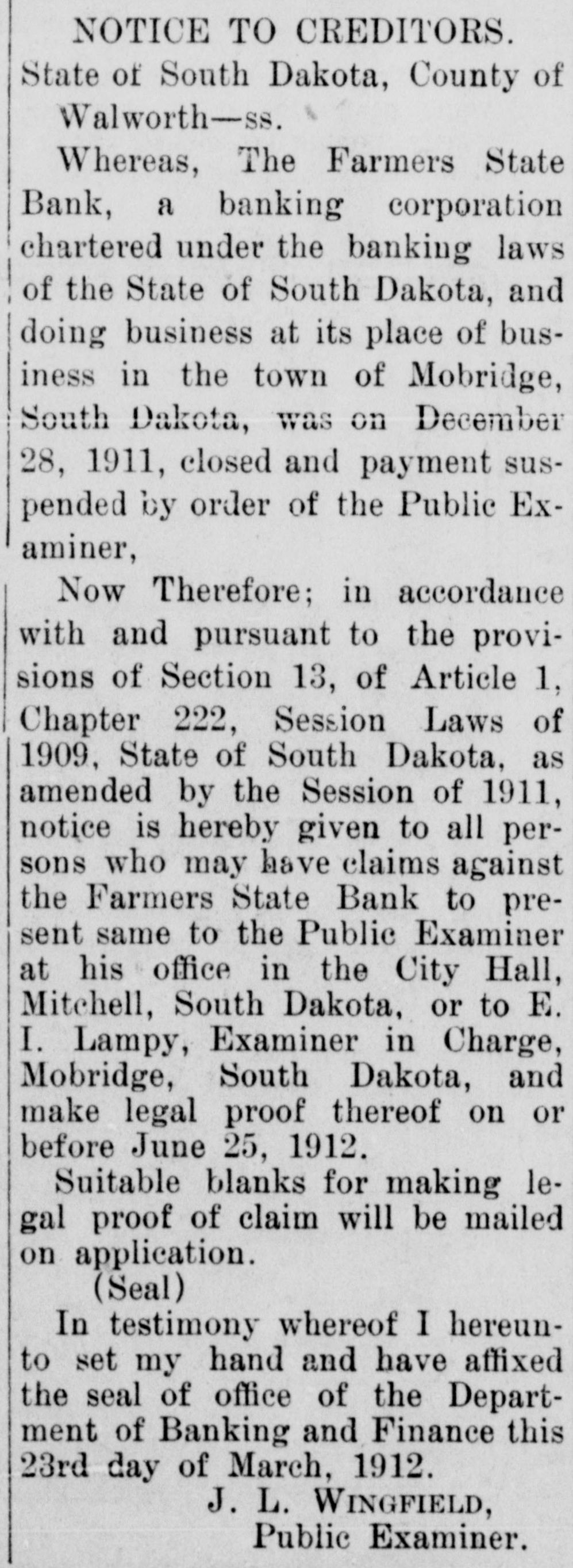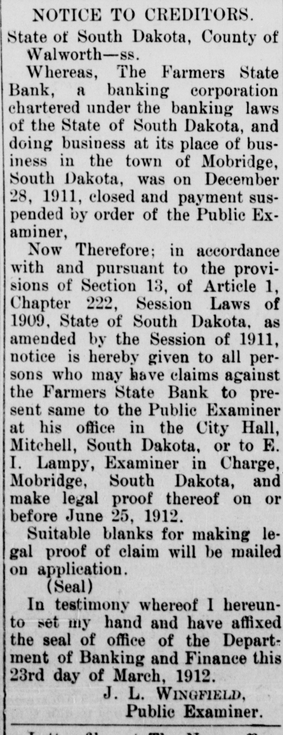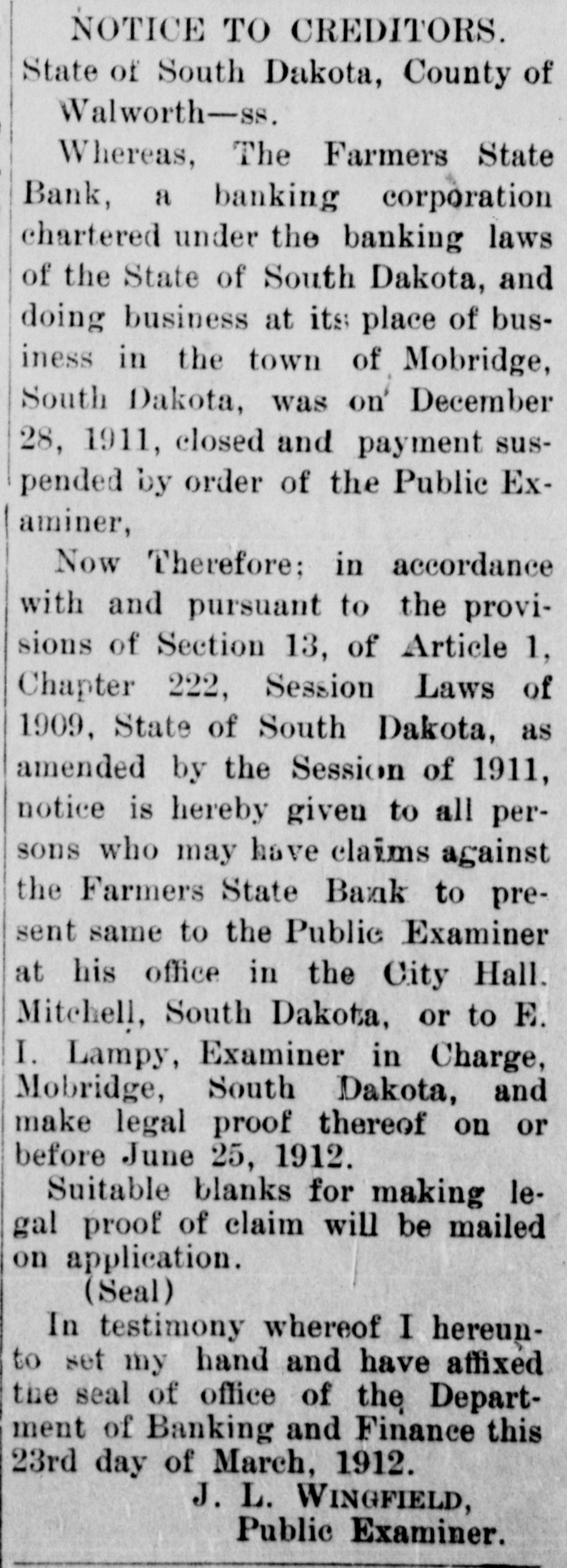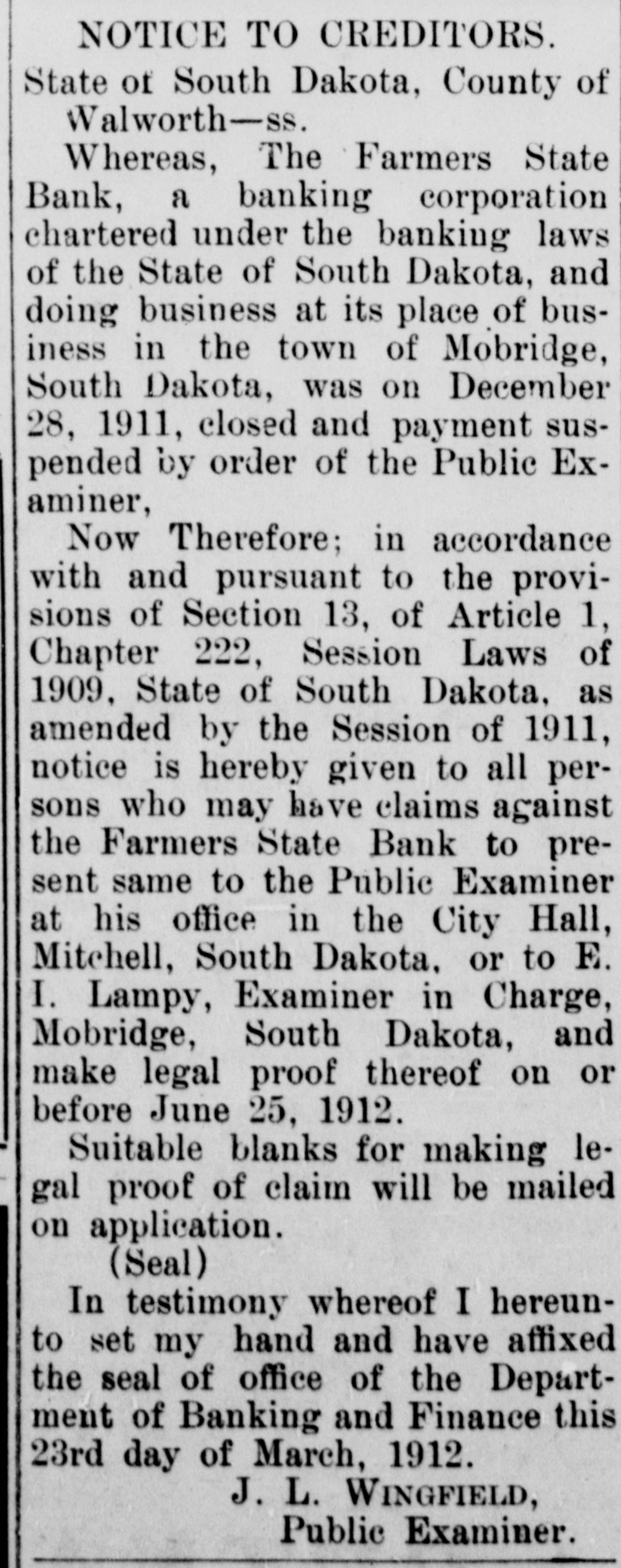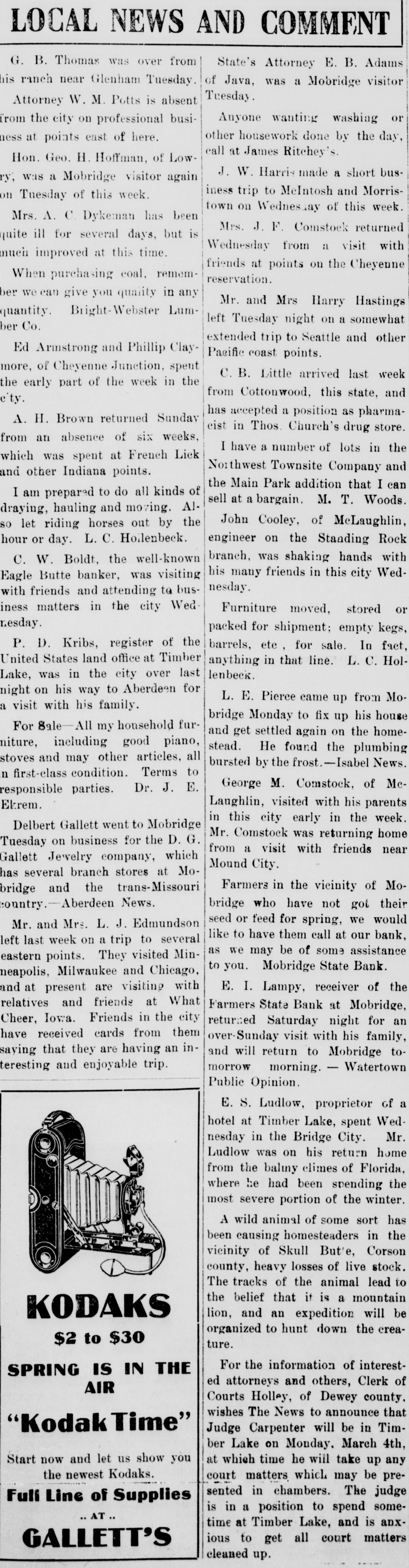LOCAL NEWS AND COMMENT G. B. Thomas was over from State's Attorney E. B. Adams ranch near Glenham Tuesday. of Java, was a Mobridge visitor Tuesday. Attorney W. M. Potts is absent Anyone wanting washing or from the city on professional busiother housework done by the day, at points east of here. call at James Ritchey's. Hon. Geo. H. Hoffman, of LowJ. W. Harris made a short buswas a Mobridge visitor again iness trip to MeIntosh and MorrisTuesday of this week. town on Wednesday of this week Mrs. A. C. Dykeman has been Mrs. J. F. Comstock returned quite ill for several days, but is Wednesday from a visit with nuch improved at this time. friends at points on the Cheyenne When purchasing coal, rememreservation. we can give you quality in any Mr. and Mrs Harry Hastings quantity. Bright-Webster Lumleft Tuesday night on a somewhat Co. extended trip to Seattle and other Ed Armstrong and Phillip ClayPacific coast points. more, of Cheyenne Junction, spent C. B. Little arrived last week the early part of the week in the from Cottonwood, this state, and e'ty. has accepted a position as pharmaA. H. Brown returned Sunday cist in Thos Church's drug store from an absence of six weeks, I have a number of lots in the which was spent at French Lick Northwest Townsite Company and and other Indiana points. the Main Park addition that I car I am prepared to do all kinds of sell at a bargain. M. T. Woods draying, hauling and moving. AlJohn Cooley, of McLaughlin let riding horses out by the hour or day. L. C. Hollenbeck. engineer on the Standing Rocl branch, was shaking hands with C. W. Boldt, the well-known his many friends in this city Wed Eagle Butte banker, was visiting nesday. with friends and attending to business matters in the city WedFurniture moved, stored o nesday. packed for shipment; empty kegs P. D. Kribs, register of the barrels, etc for sale. In fact United States land office at Timber anything in that line. L. C. Hol lenbeck. Lake, was in the city over last night on his way to Aberdeen for L. E. Pierce came up from Mo visit with his family. bridge Monday to fix up his house For Sale-All my household furand get settled again on the home niture, including good piano, stead. He found the plumbing stoves and may other articles, all bursted by the frost. -Isabel News first-class condition. Terms to George M. Comstock, of Mc responsible parties. Dr. J. E. Laughlin, visited with his parents Ekrem. in this city early in the week Delbert Gallett went to Mobridge Mr. Comstock was returning home Tuesday on business for the D. G. from a visit with friends nea Gallett Jewelry company, which Mound City. several branch stores at MoFarmers in the vicinity of Mo bridge and the trans-Missouri bridge who have not got their ountry.-Aberdeen News. seed or feed for spring, we would Mr. and Mrs. L. J. Edmundson like to have them call at our bank left last week on a trip to several as we may be of some assistance eastern points. They visited Minto you. Mobridge State Bank. neapolis, Milwaukee and Chicago, E. I. Lampy, receiver of the and at present are visiting with relatives and friends at What Farmers State Bank at Mobridge Cheer, Iowa. Friends in the city returned Saturday night for an have received cards from them over-Sunday visit with his family saying that they are having an inand will return to Mobridge to teresting and enjoyable trip. morrow morning. - Watertown Public Opinion. E. S. Ludlow, proprietor of a hotel at Timber Lake, spent Wed nesday in the Bridge City. Mr Ludlow was on his return home from the baliny climes of Florida where he had been spending the most severe portion of the winter A wild animal of some sort has been causing homesteaders in the vicinity of Skull But'e, Corson county, heavy losses of live stock The tracks of the animal lead to the belief that it is a mountain KODAKS lion, and an expedition will be organized to hunt down the crea $2 to $30 ture. For the information of interest SPRING IS IN THE ed attorneys and others, Clerk of AIR Courts Holley, of Dewey county wishes The News to announce that "Kodak Time" Judge Carpenter will be in Tim ber Lake on Monday. March 4th Start now and let us show you at which time he will take up any the newest Kodaks. court matters which may be presented in chambers. The judge Full Line of Supplies is in a position to spend some AT time at Timber Lake, and is anx ious to get all court matters GALLETT'S cleaned up.