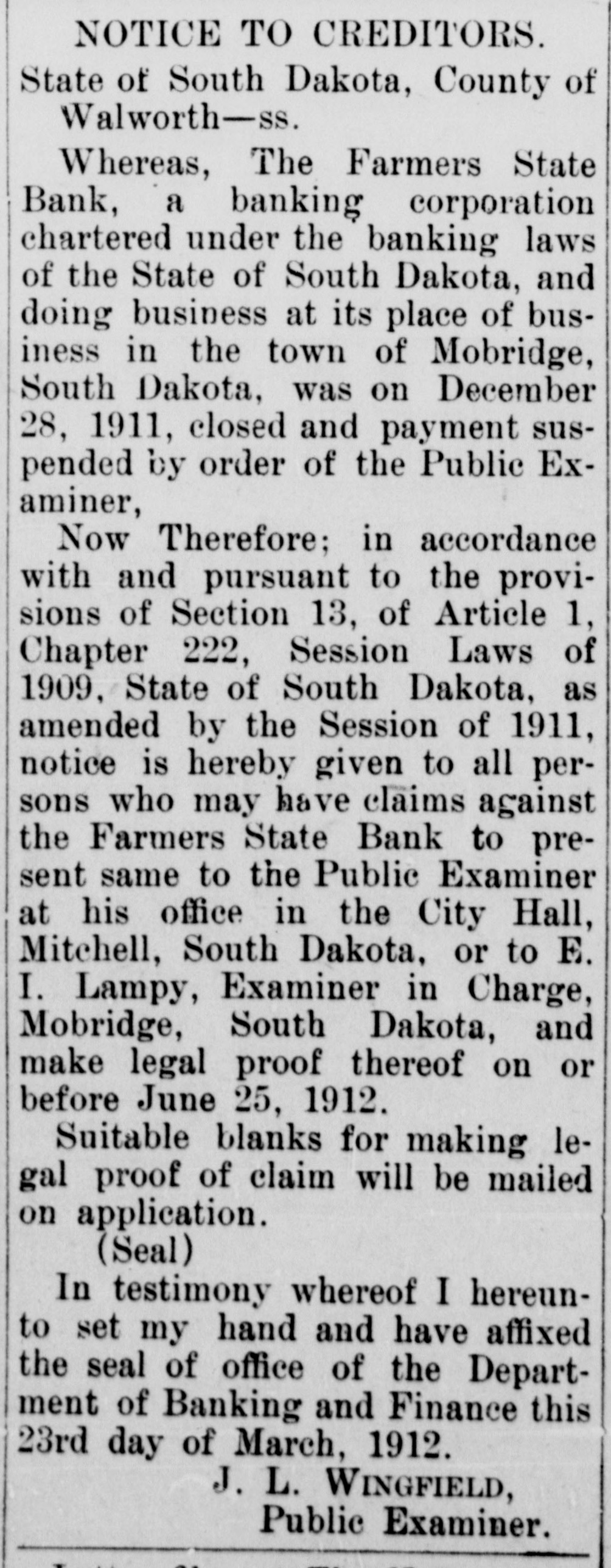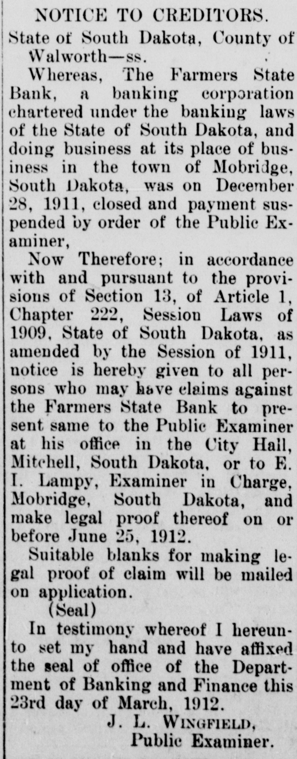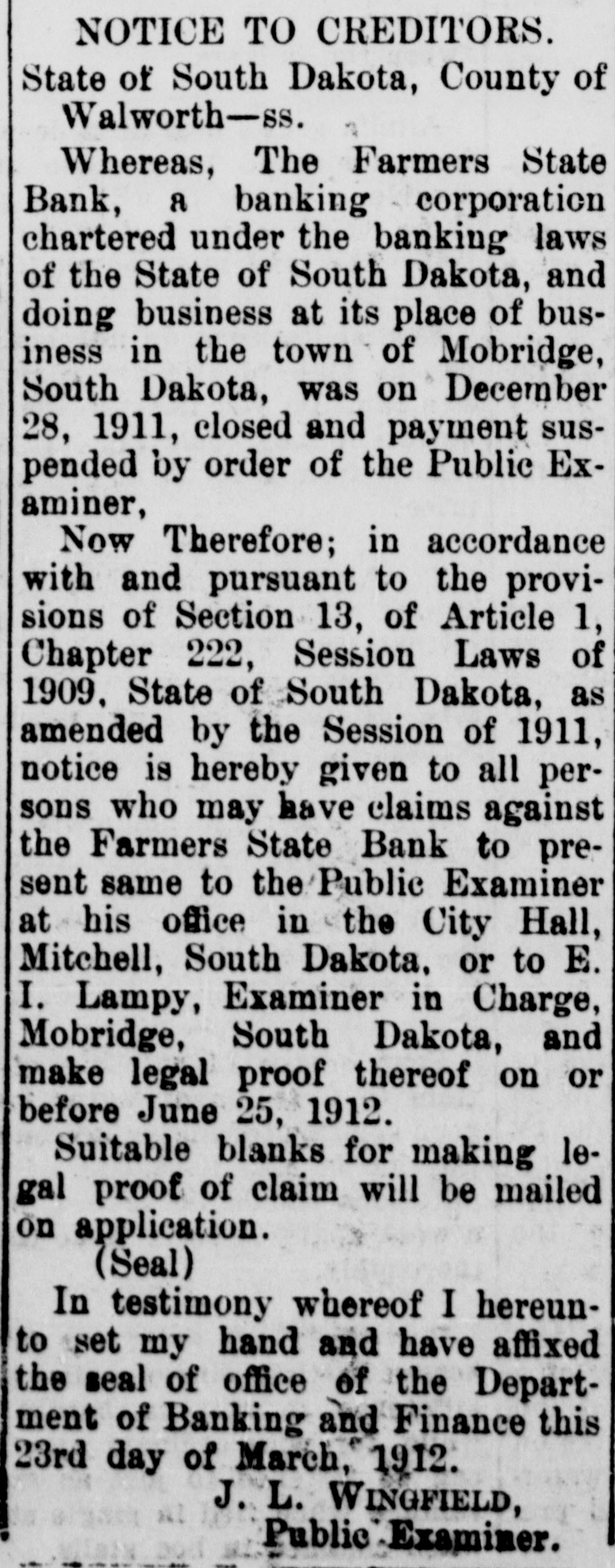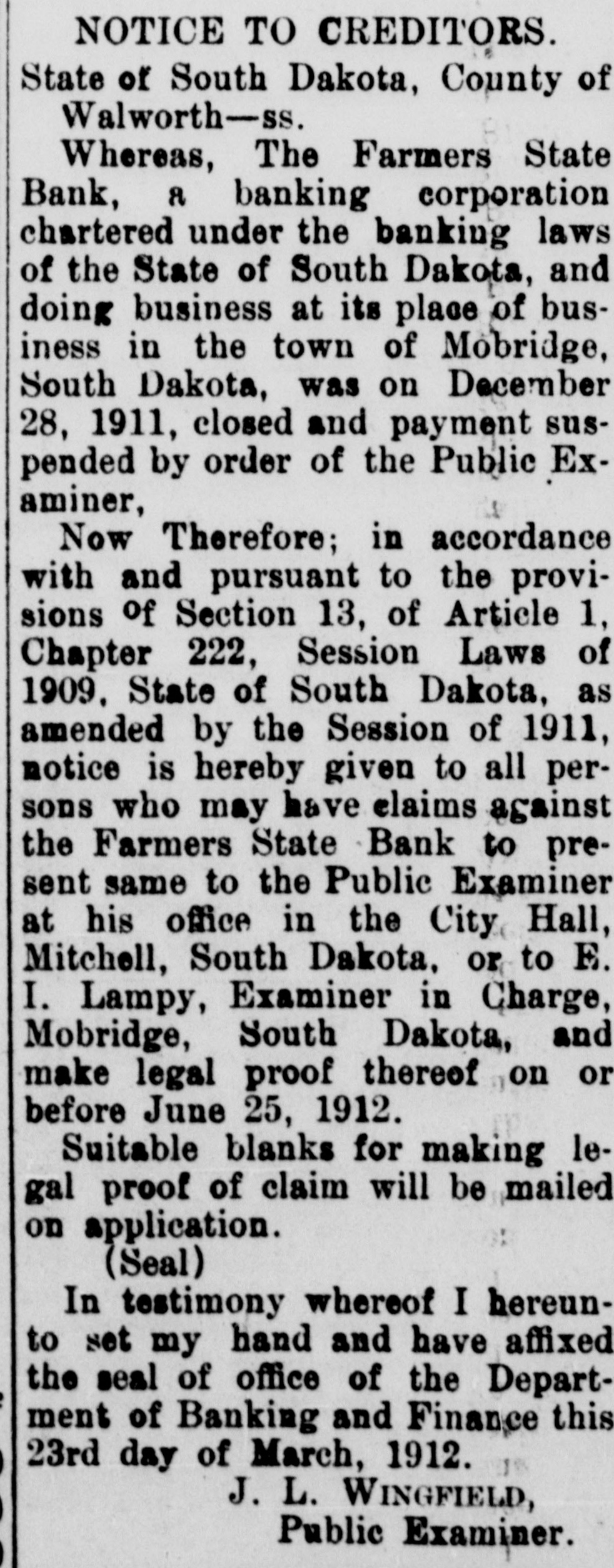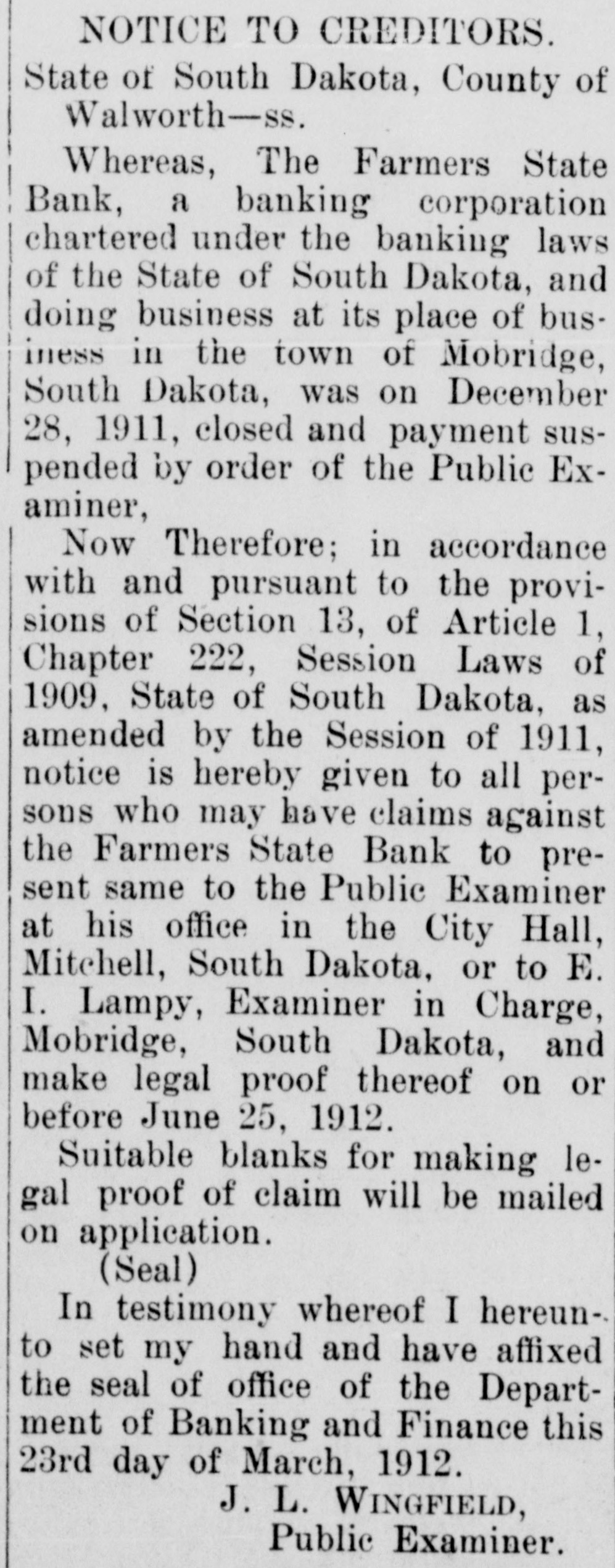LOCAL NEWS AND COMMENT G. B. Thomas was over from State's Attorney E. B. Adams ranch near Glenham Tuesday. of Java, was a Mobridge visitor Tuesday. Attorney W. M. Potts is absent Anyone wanting washing or from the city on professional busiother housework done by the day, at points east of here. call at James Ritchey's. Hon. Geo. H. Hoffman, of LowJ. W. Harris made a short buswas a Mobridge visitor again iness trip to MeIntosh and MorrisTuesday of this week. town on Wednesday of this week Mrs. A. C. Dykeman has been Mrs. J. F. Comstock returned quite ill for several days, but is Wednesday from a visit with nuch improved at this time. friends at points on the Cheyenne When purchasing coal, rememreservation. we can give you quality in any Mr. and Mrs Harry Hastings quantity. Bright-Webster Lumleft Tuesday night on a somewhat Co. extended trip to Seattle and other Ed Armstrong and Phillip ClayPacific coast points. more, of Cheyenne Junction, spent C. B. Little arrived last week the early part of the week in the from Cottonwood, this state, and e'ty. has accepted a position as pharmaA. H. Brown returned Sunday cist in Thos Church's drug store from an absence of six weeks, I have a number of lots in the which was spent at French Lick Northwest Townsite Company and and other Indiana points. the Main Park addition that I car I am prepared to do all kinds of sell at a bargain. M. T. Woods draying, hauling and moving. AlJohn Cooley, of McLaughlin let riding horses out by the hour or day. L. C. Hollenbeck. engineer on the Standing Rocl branch, was shaking hands with C. W. Boldt, the well-known his many friends in this city Wed Eagle Butte banker, was visiting nesday. with friends and attending to business matters in the city WedFurniture moved, stored o nesday. packed for shipment; empty kegs P. D. Kribs, register of the barrels, etc for sale. In fact United States land office at Timber anything in that line. L. C. Hol lenbeck. Lake, was in the city over last night on his way to Aberdeen for L. E. Pierce came up from Mo visit with his family. bridge Monday to fix up his house For Sale-All my household furand get settled again on the home niture, including good piano, stead. He found the plumbing stoves and may other articles, all bursted by the frost. -Isabel News first-class condition. Terms to George M. Comstock, of Mc responsible parties. Dr. J. E. Laughlin, visited with his parents Ekrem. in this city early in the week Delbert Gallett went to Mobridge Mr. Comstock was returning home Tuesday on business for the D. G. from a visit with friends nea Gallett Jewelry company, which Mound City. several branch stores at MoFarmers in the vicinity of Mo bridge and the trans-Missouri bridge who have not got their ountry.-Aberdeen News. seed or feed for spring, we would Mr. and Mrs. L. J. Edmundson like to have them call at our bank left last week on a trip to several as we may be of some assistance eastern points. They visited Minto you. Mobridge State Bank. neapolis, Milwaukee and Chicago, E. I. Lampy, receiver of the and at present are visiting with relatives and friends at What Farmers State Bank at Mobridge Cheer, Iowa. Friends in the city returned Saturday night for an have received cards from them over-Sunday visit with his family saying that they are having an inand will return to Mobridge to teresting and enjoyable trip. morrow morning. - Watertown Public Opinion. E. S. Ludlow, proprietor of a hotel at Timber Lake, spent Wed nesday in the Bridge City. Mr Ludlow was on his return home from the baliny climes of Florida where he had been spending the most severe portion of the winter A wild animal of some sort has been causing homesteaders in the vicinity of Skull But'e, Corson county, heavy losses of live stock The tracks of the animal lead to the belief that it is a mountain KODAKS lion, and an expedition will be organized to hunt down the crea $2 to $30 ture. For the information of interest SPRING IS IN THE ed attorneys and others, Clerk of AIR Courts Holley, of Dewey county wishes The News to announce that "Kodak Time" Judge Carpenter will be in Tim ber Lake on Monday. March 4th Start now and let us show you at which time he will take up any the newest Kodaks. court matters which may be presented in chambers. The judge Full Line of Supplies is in a position to spend some AT time at Timber Lake, and is anx ious to get all court matters GALLETT'S cleaned up.