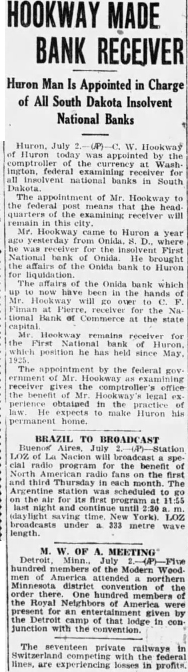 HOOKWAY MADE BANK RECEIVER Huron Man Is Appointed in Charge of All South Dakota Insolvent National Banks Huron, July W. Hookway Huron appointed comptroller the for national banks in South The appointment of Mr. Hookway to the federal post means the Mr. Huron year yesterday where for the First National bank Onida He brought the affairs of the Onida to Huron liquidation. The affairs the Onida bank which hands go Fiman for the tional Bank of Commerce at the state Hookway remains receiver for First National position he has held since The by the federal gov. ernment Mr. receiver the office the Mr obtained in the expects to make Huron his home. BRAZIL TO BROADCAST Aires, July Station of Nacion clal for the fans on the first and Thursday in each The scheduled the for its last night and York). LOZ broadcasts under 333 metre wave length. M. W. OF A. MEETING Detroit, Minn., July the Modern Wood men America attended northern district convention of the order the there. One Royal Neighbors America present for an given by the of that lodge in conjunction with the convention. The private railways with the lines, are experiencing in profits.